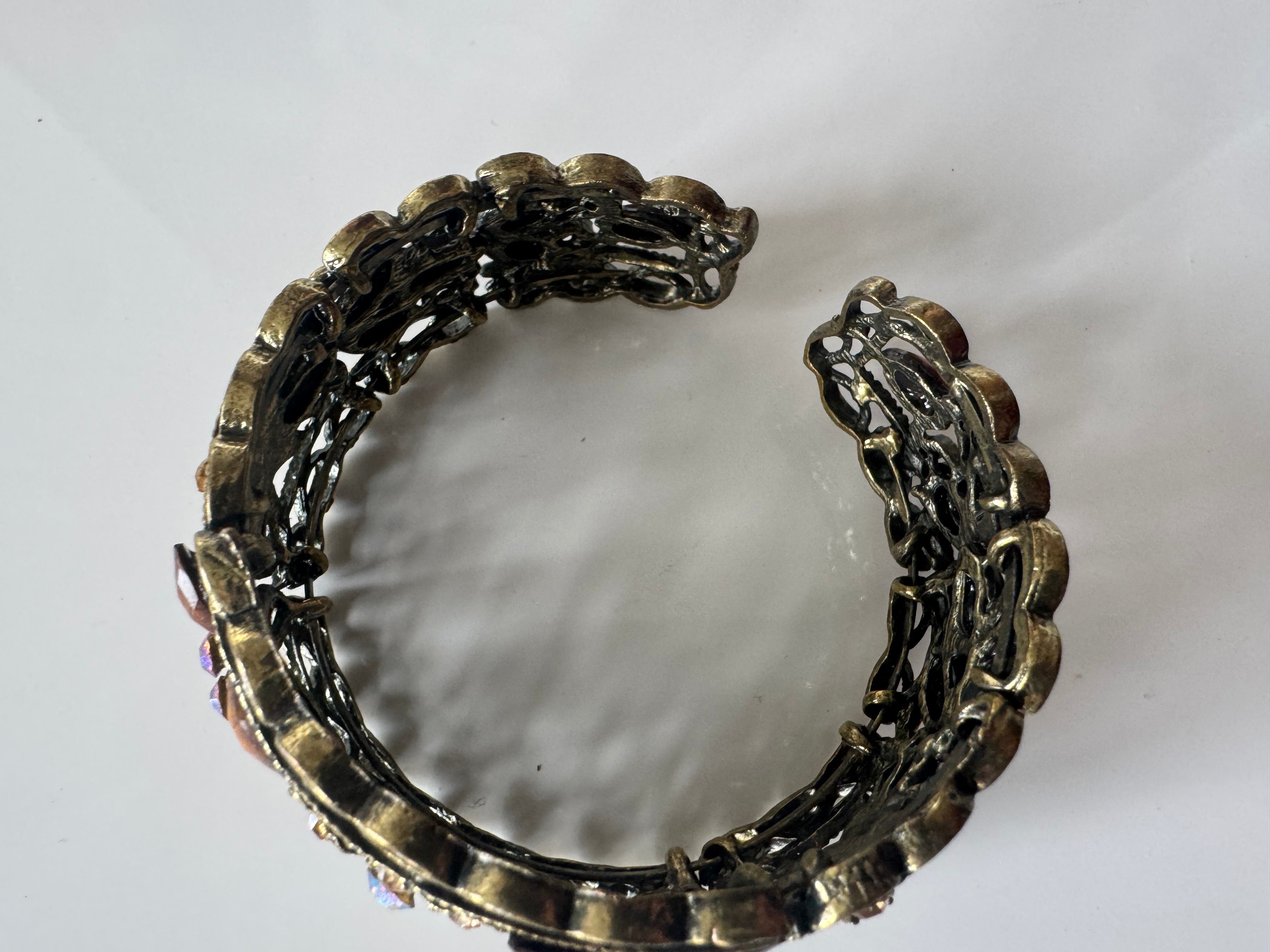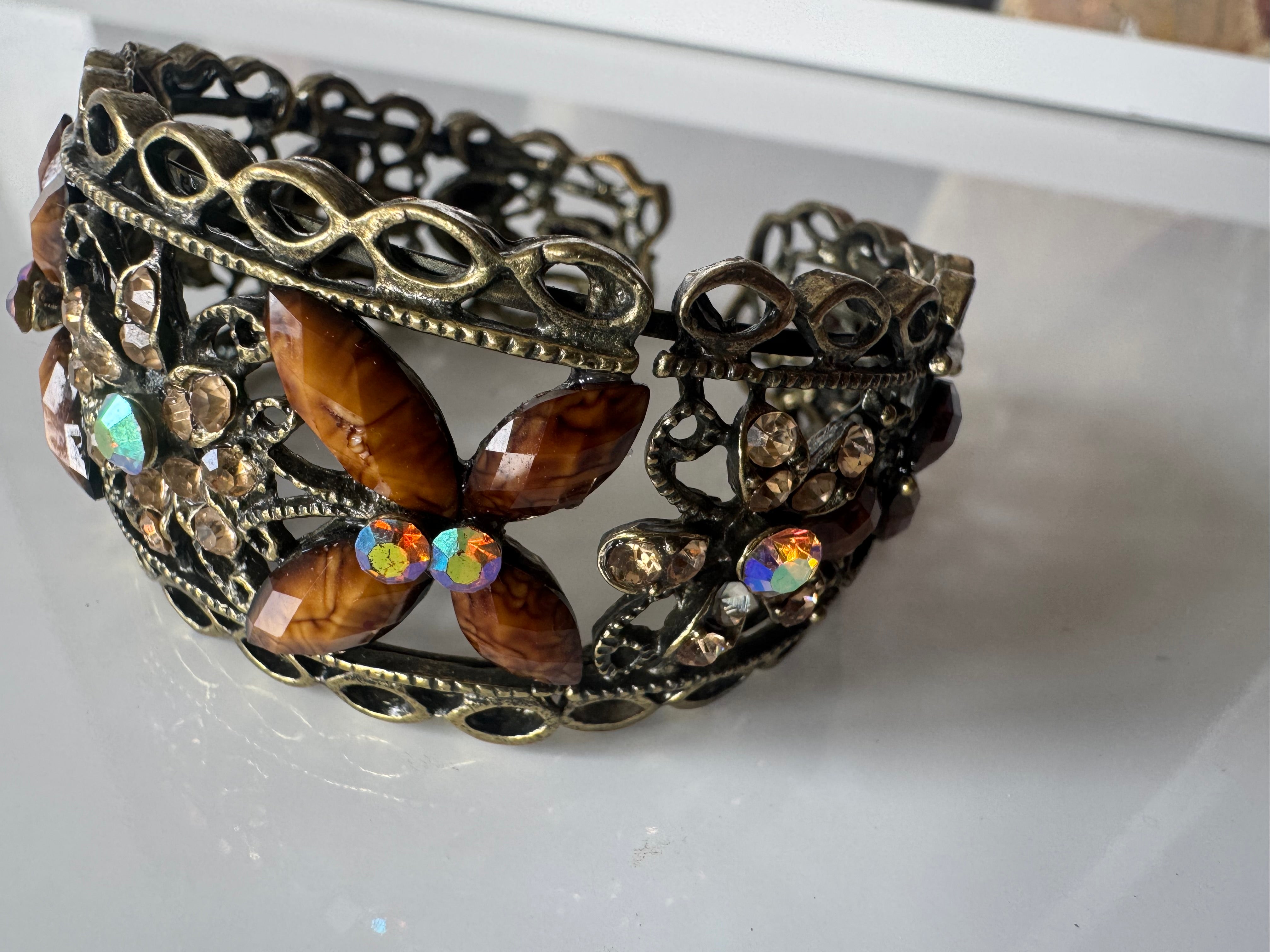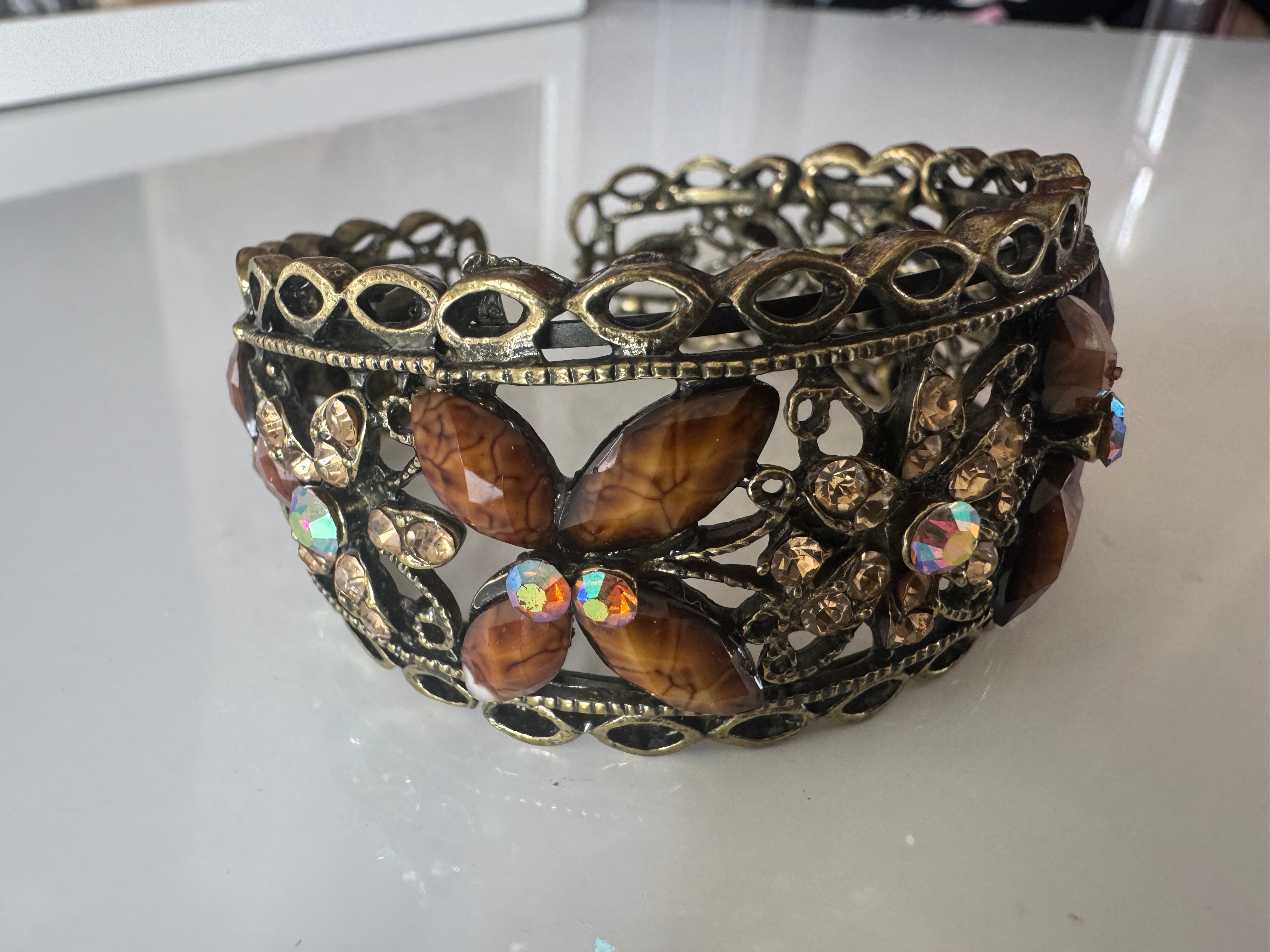Brass Vintage Cuff, with what looks like Tiger Eye flower petal detailing around full piece and crystal rhinestones.