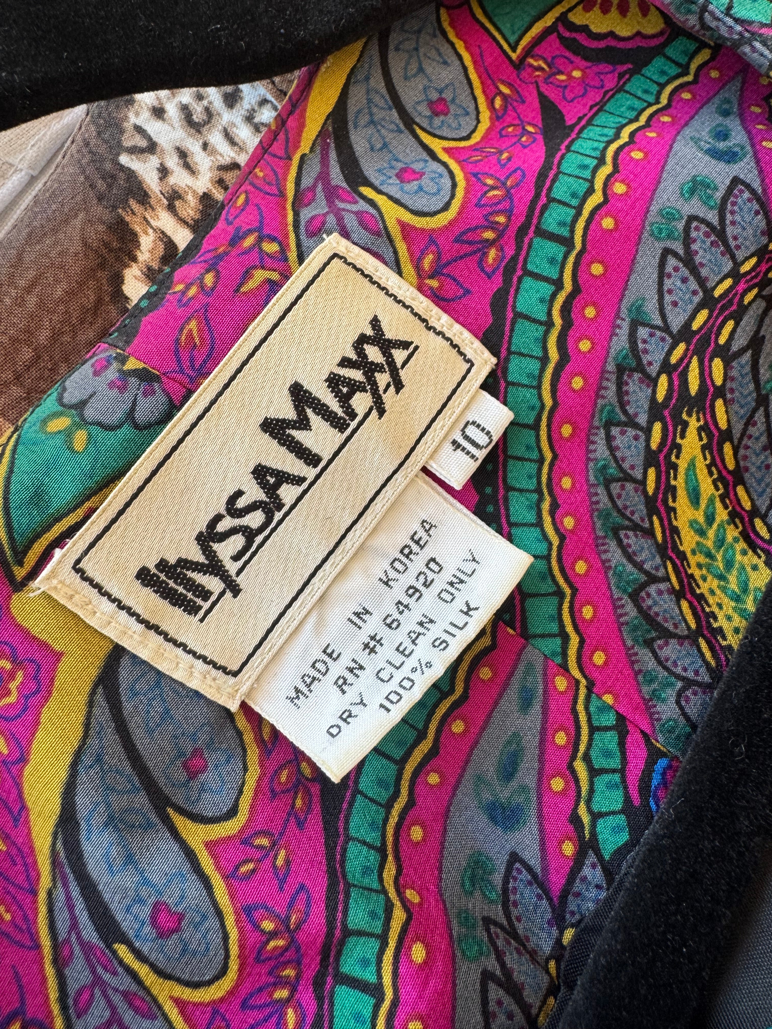 Stunningly bright Paisley short v 80s, 100% Silk, size 10 - I'd say true to Size NZ size 10. Beautifully tailored piece with fabric covered buttons. In Immaculate condition, pockets still have their basting stitches. Fully lined. Features a piece of fabric that drapes over one shoulder and attaches to a button on the front breast.