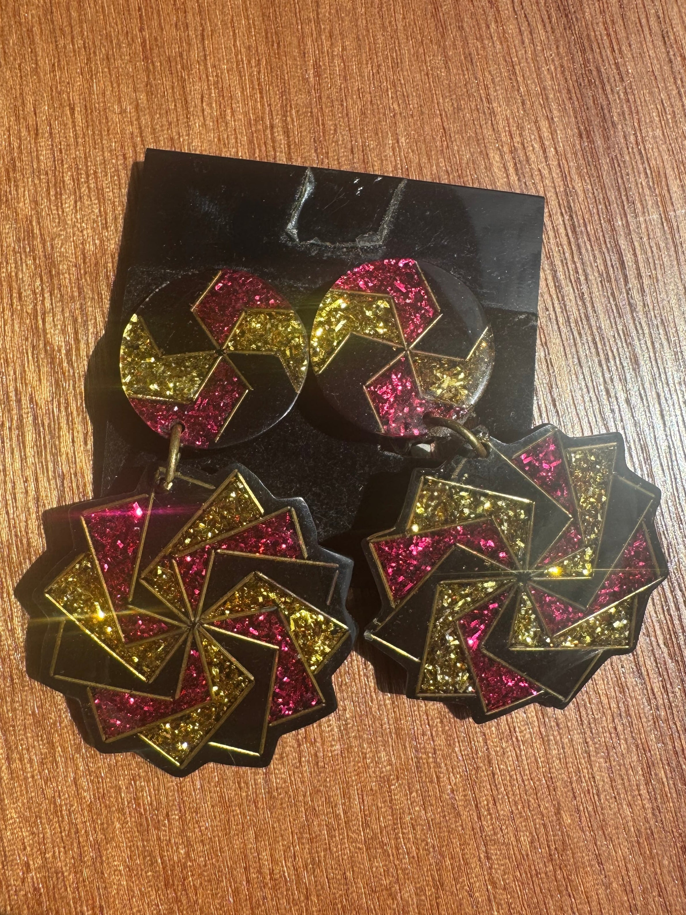 Gorgeous Acrylic Dangle Earrings, deadstock vintage 70s/80s, Black with gold and magenta pattern