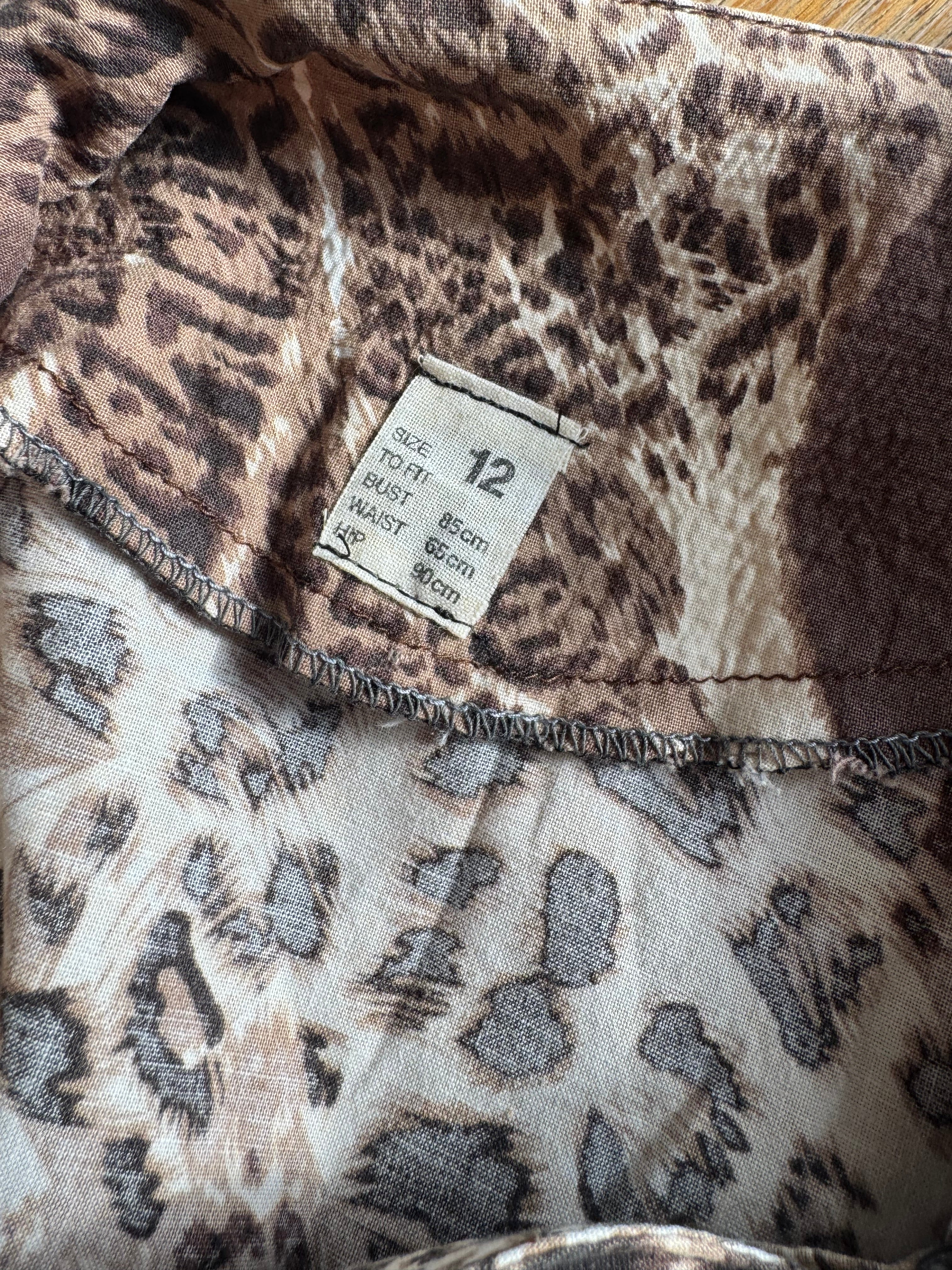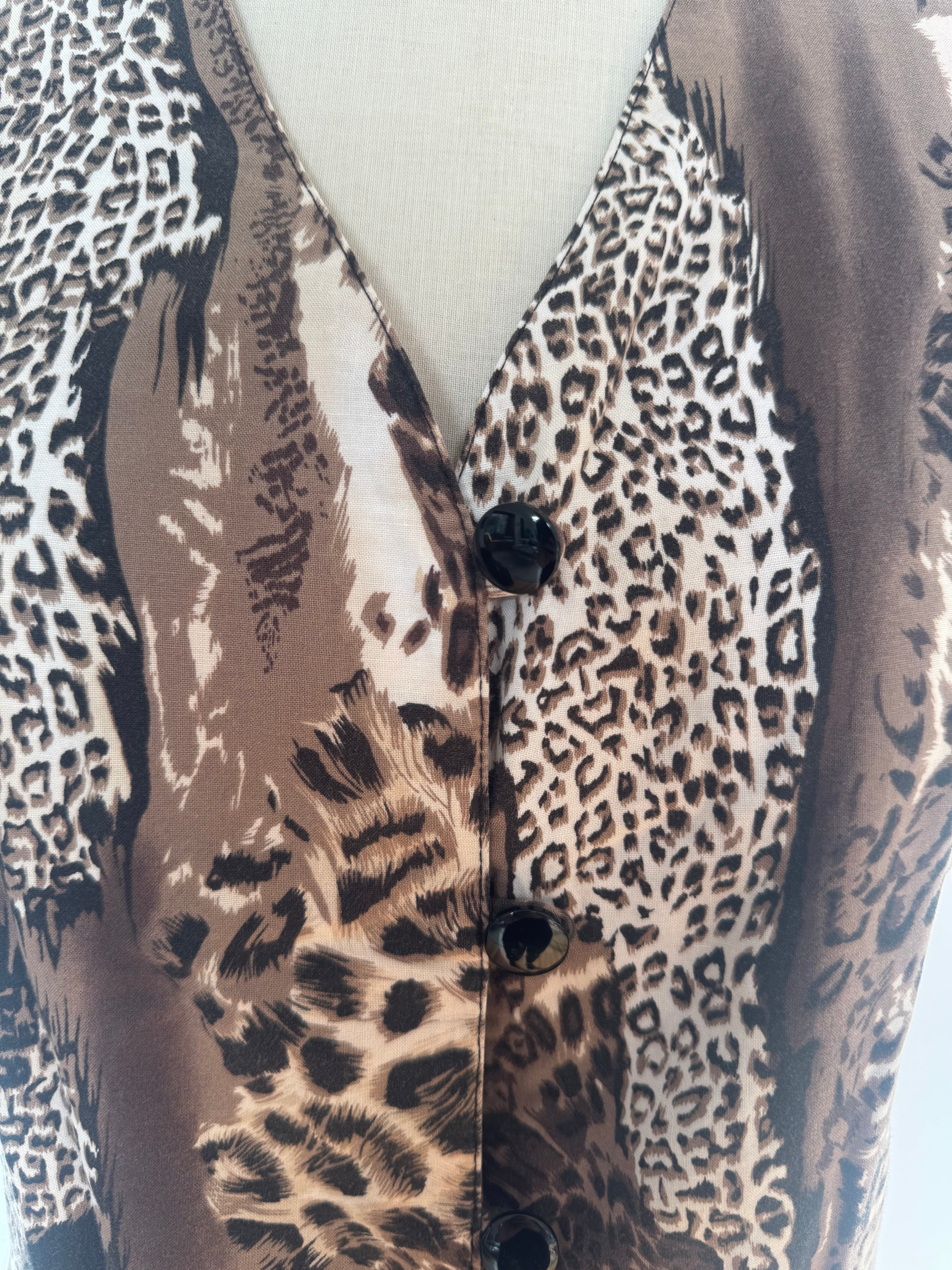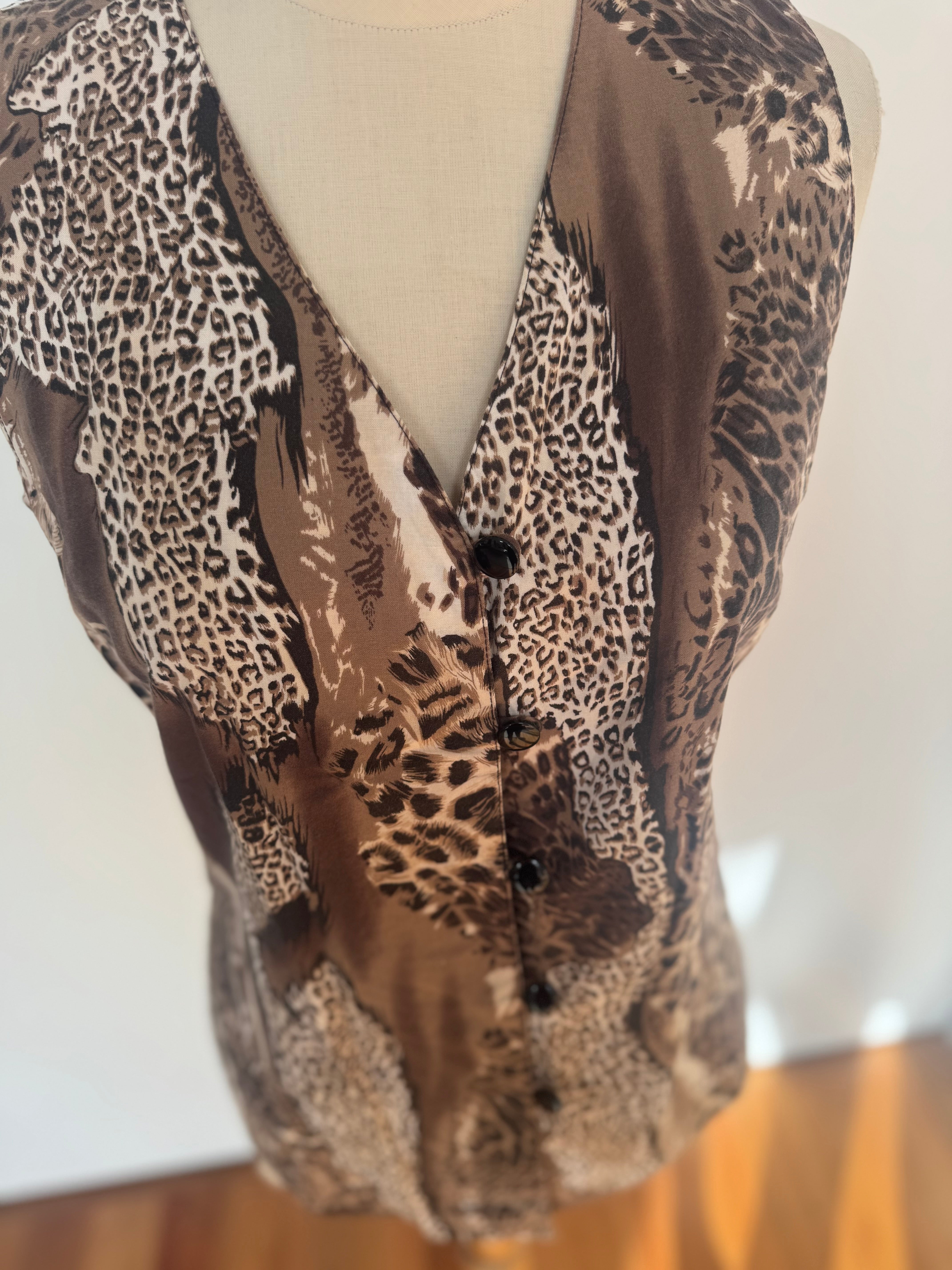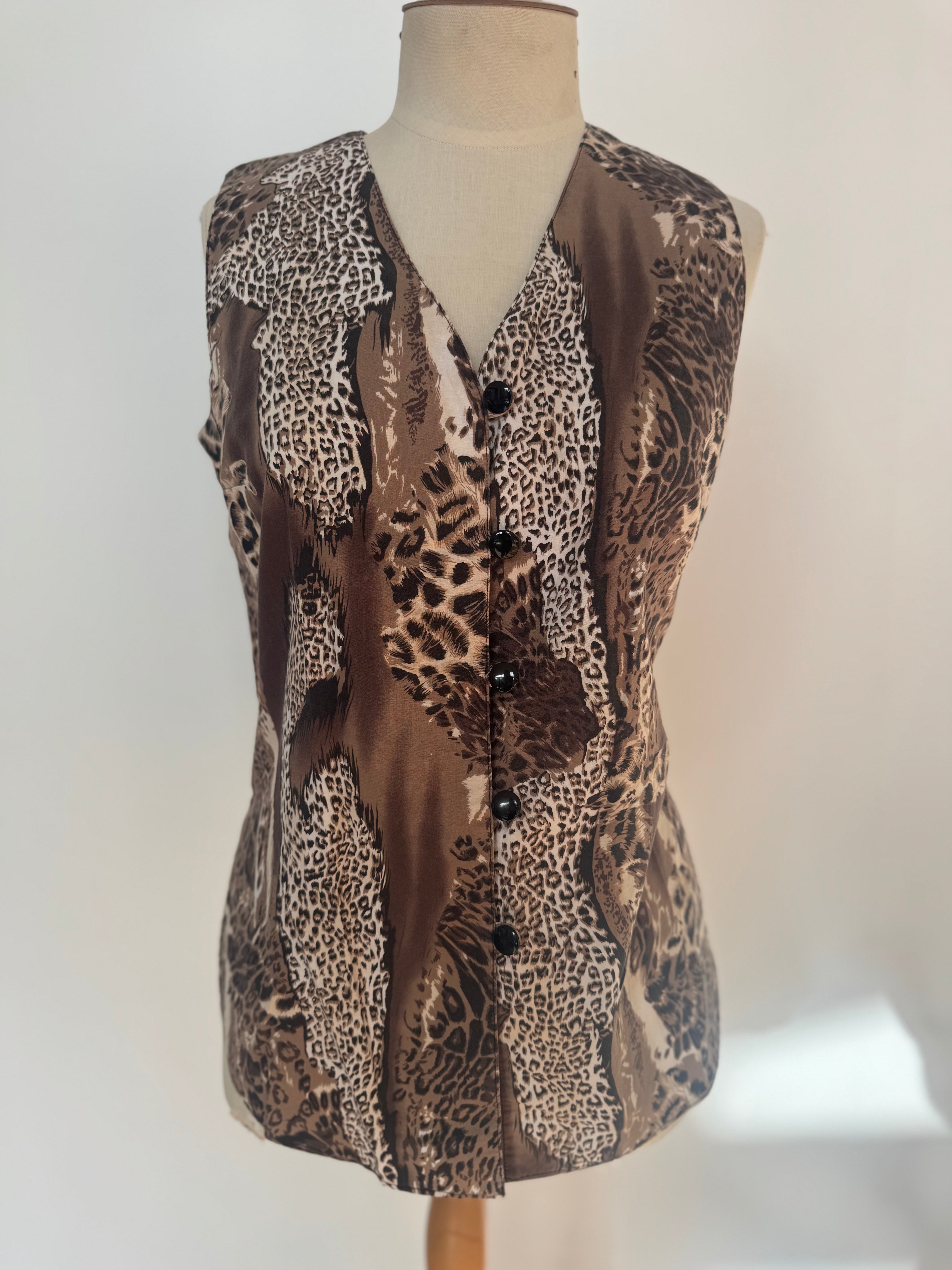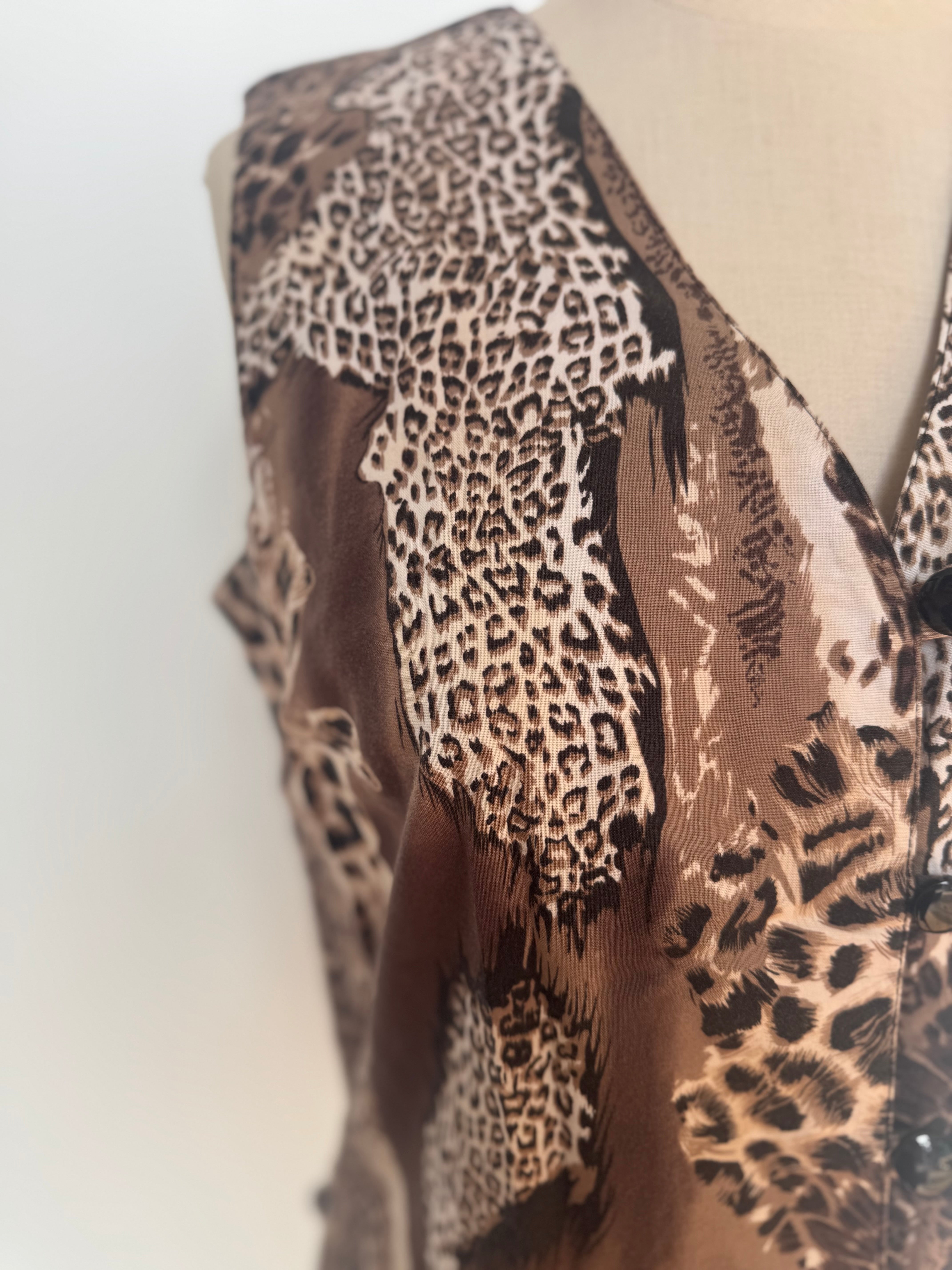 Animal Print, vest with black button up - small slits up each side. Good condition, fabric comp unknown but feels like cotton/rayon.