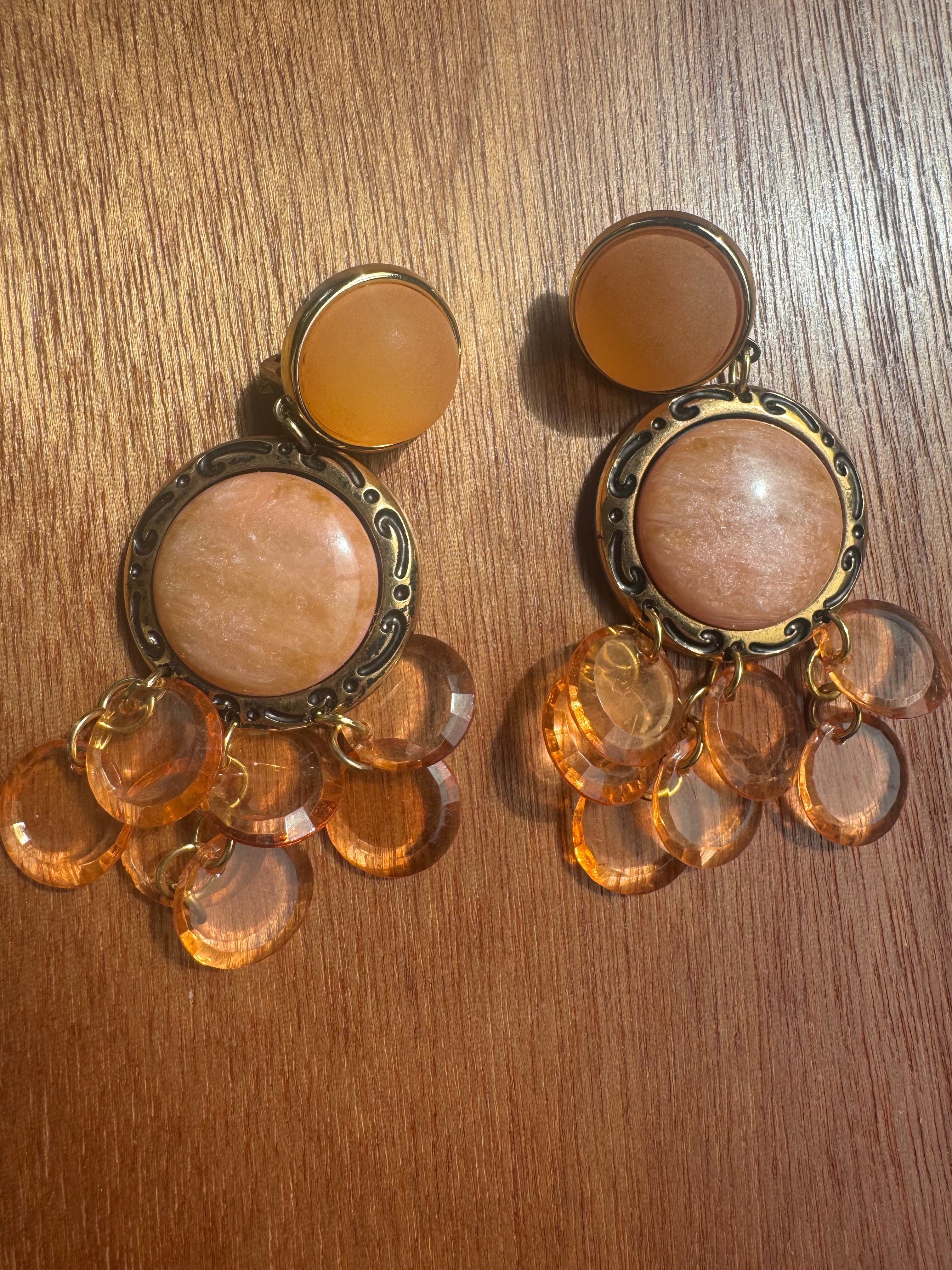 Vintage Peach & Gold Cabochon Dangly earrings with plastic disc beads. Beautiful Design. Excellent Condition.
