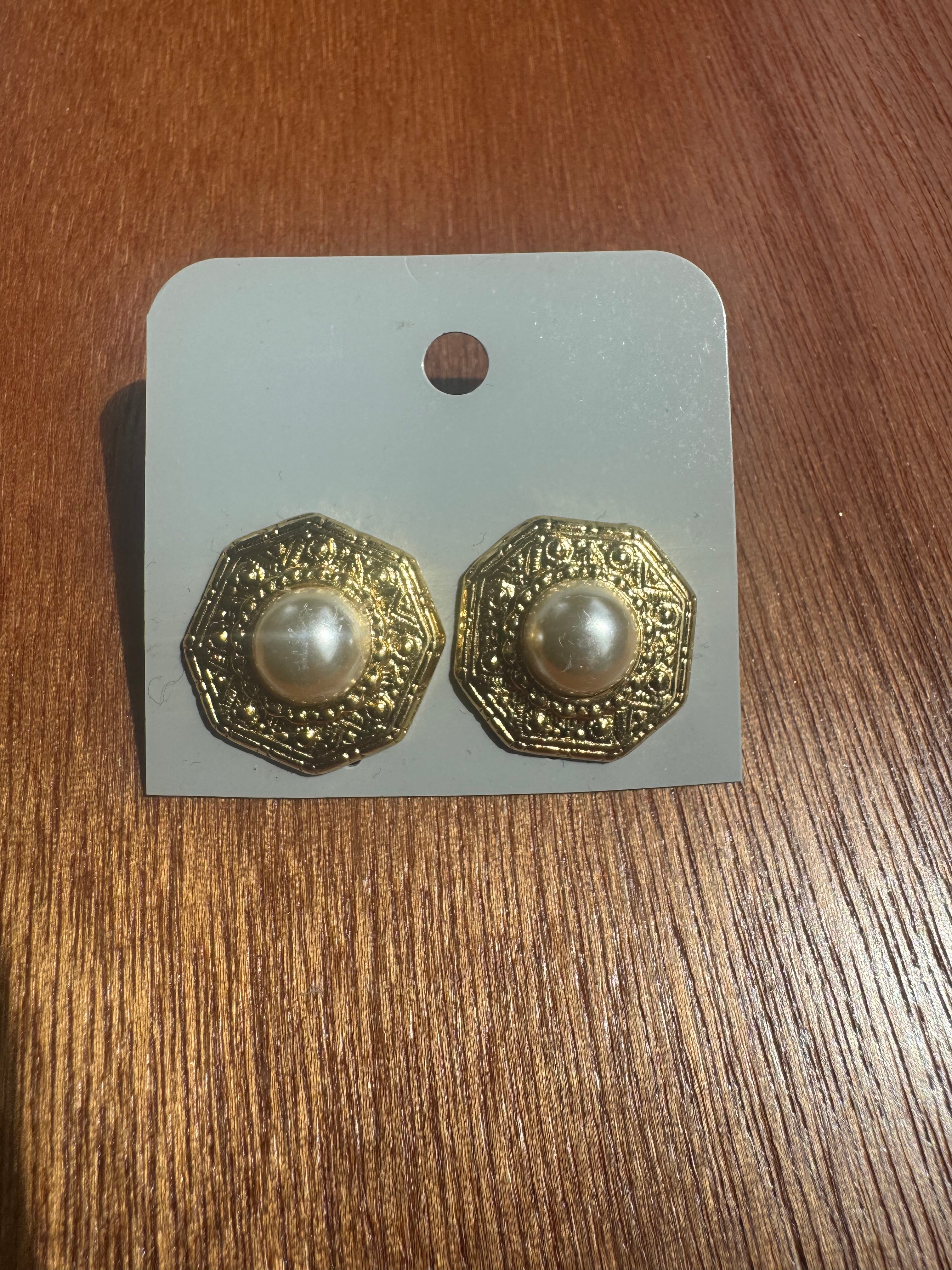 Classic Design, Hexagonal with pearl cabochons, textured gold surround. Excellent condition, with original backing card. V Chanel like.