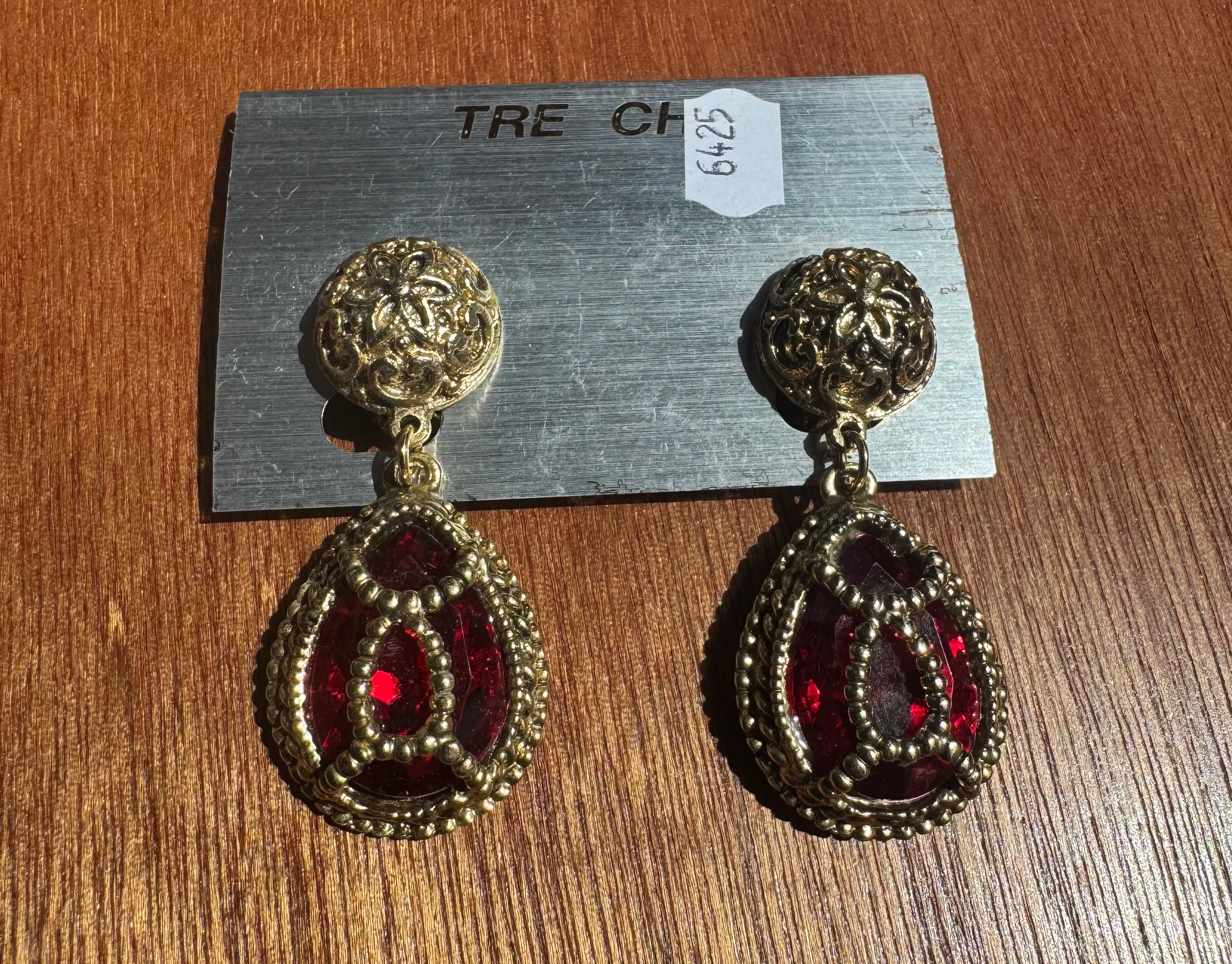 Vintage Clip on Earrings, bold with teardrop pendant with Red stone and gold trim.