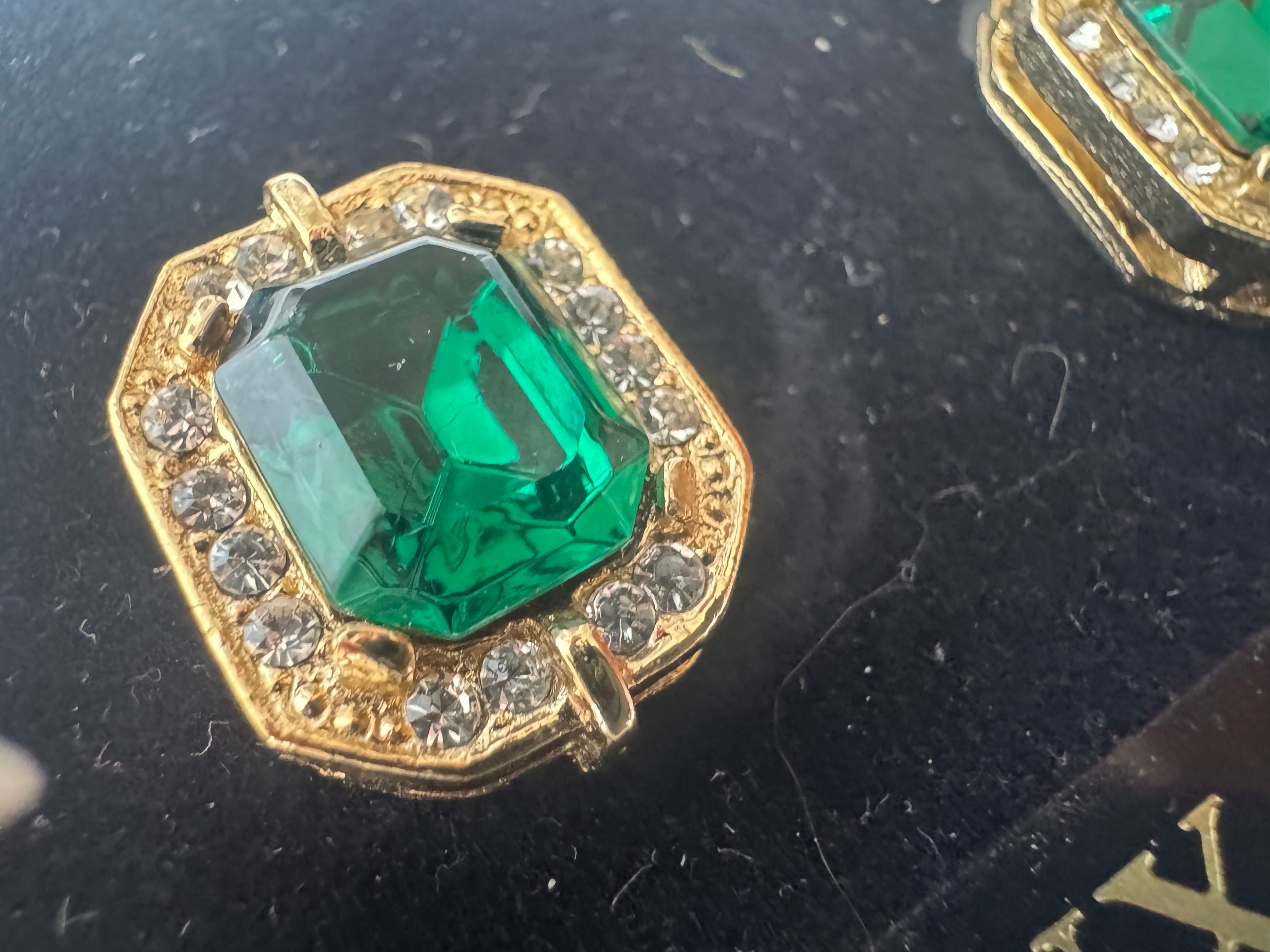 Vintage gemstone clip ons, stunning emerald green glass stone with clear crystals.