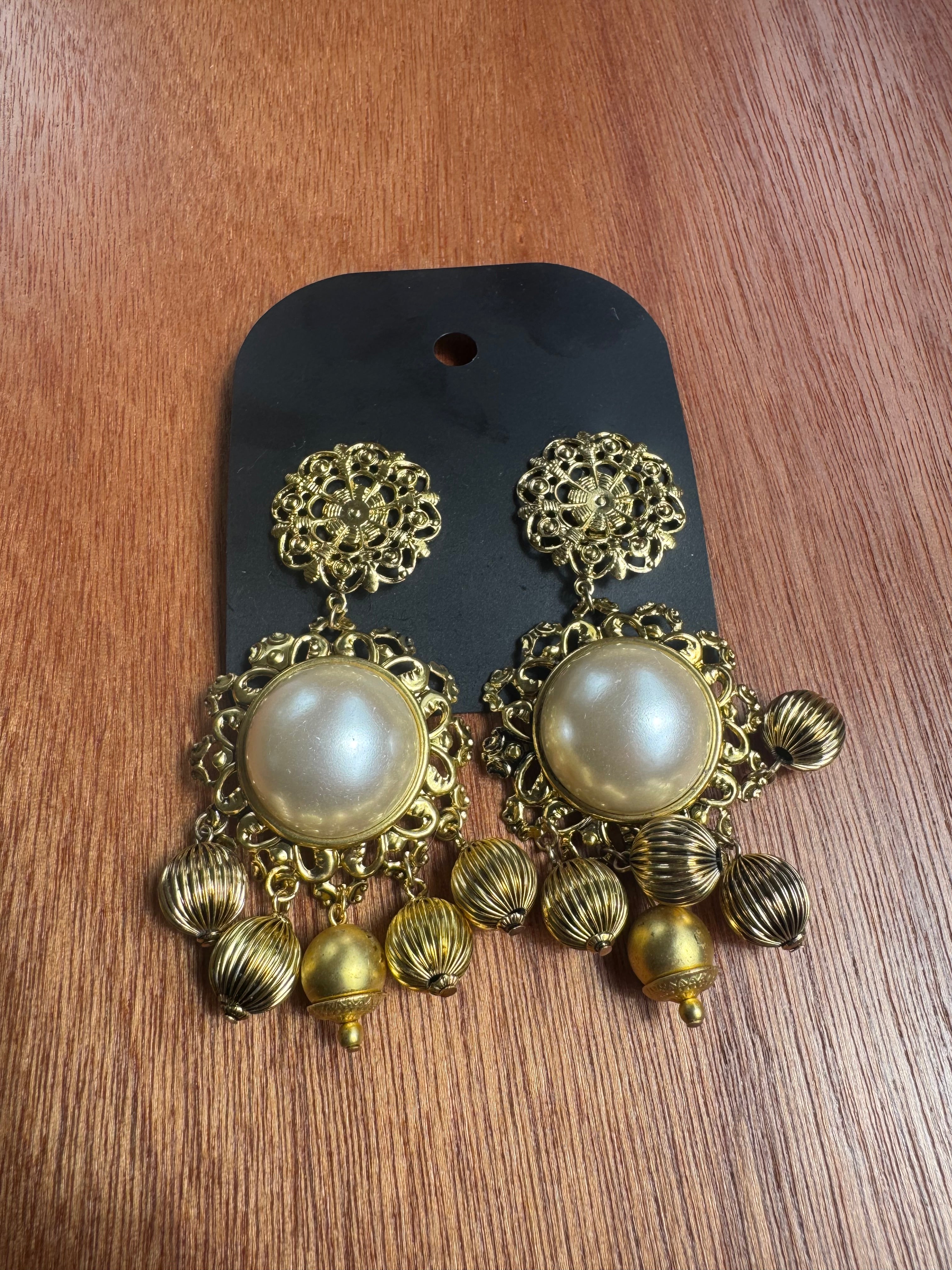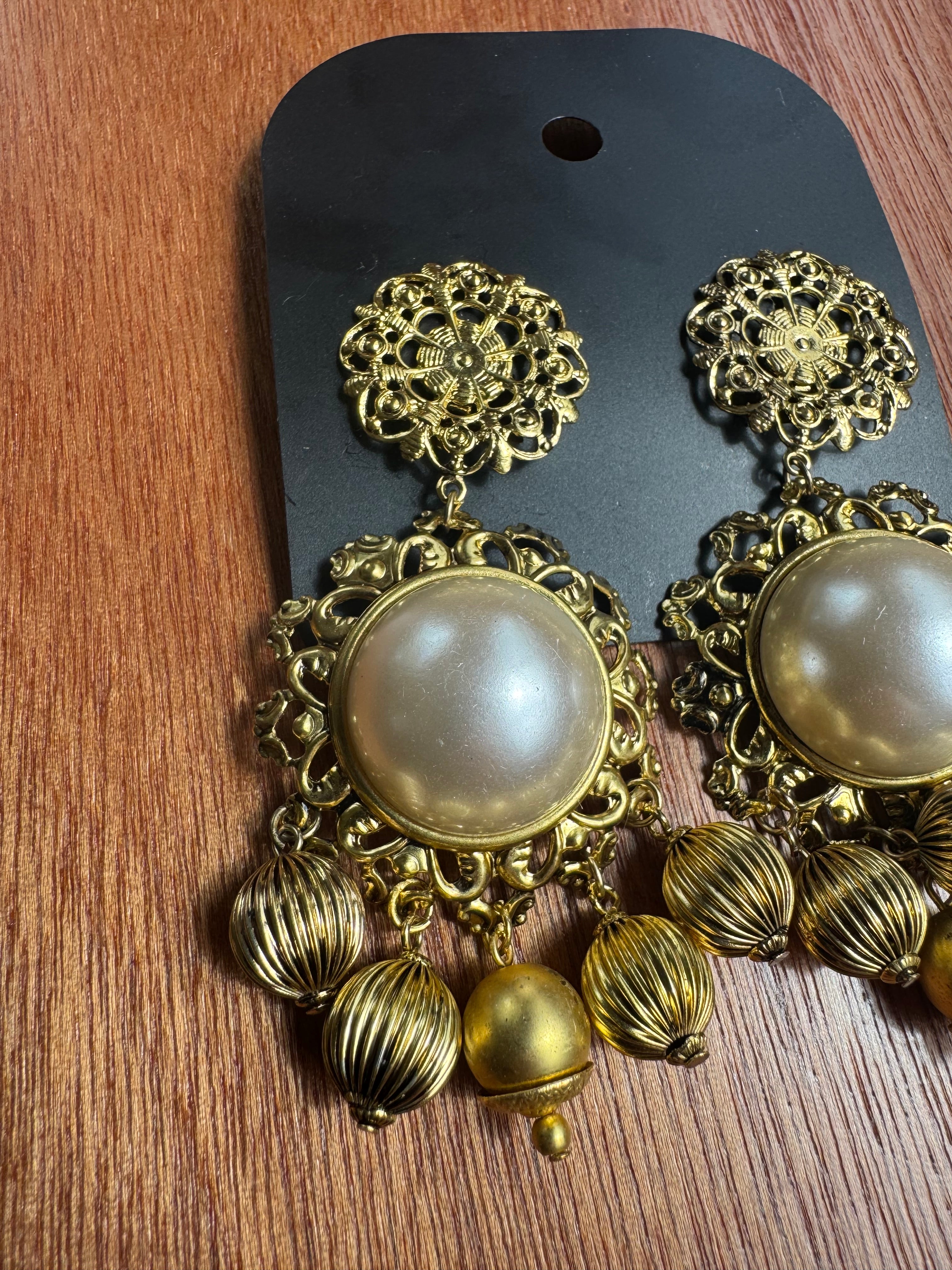Delicate Gold and Pearl Earrings with gold beads. 40mm diameter, 90mms dangly