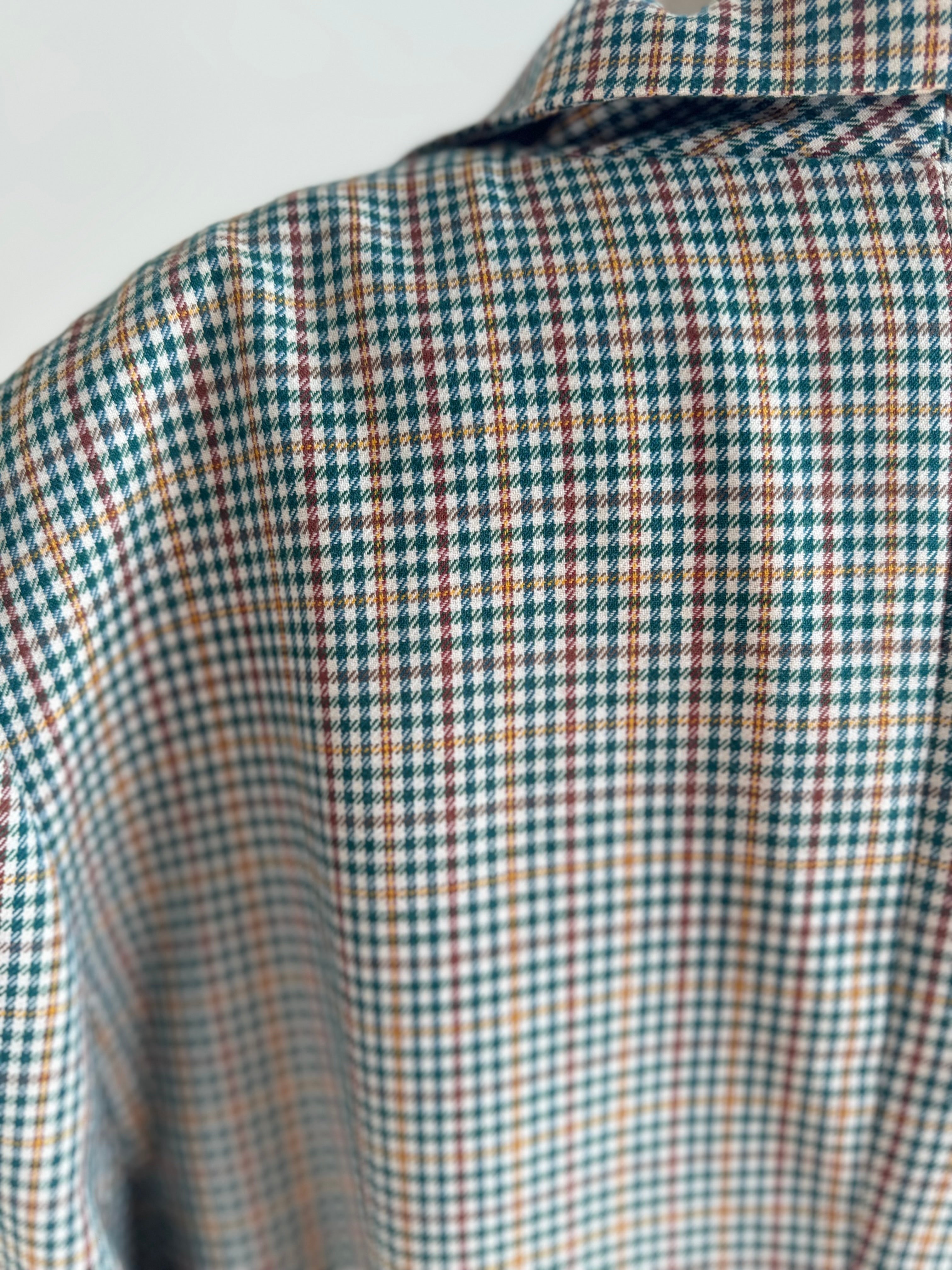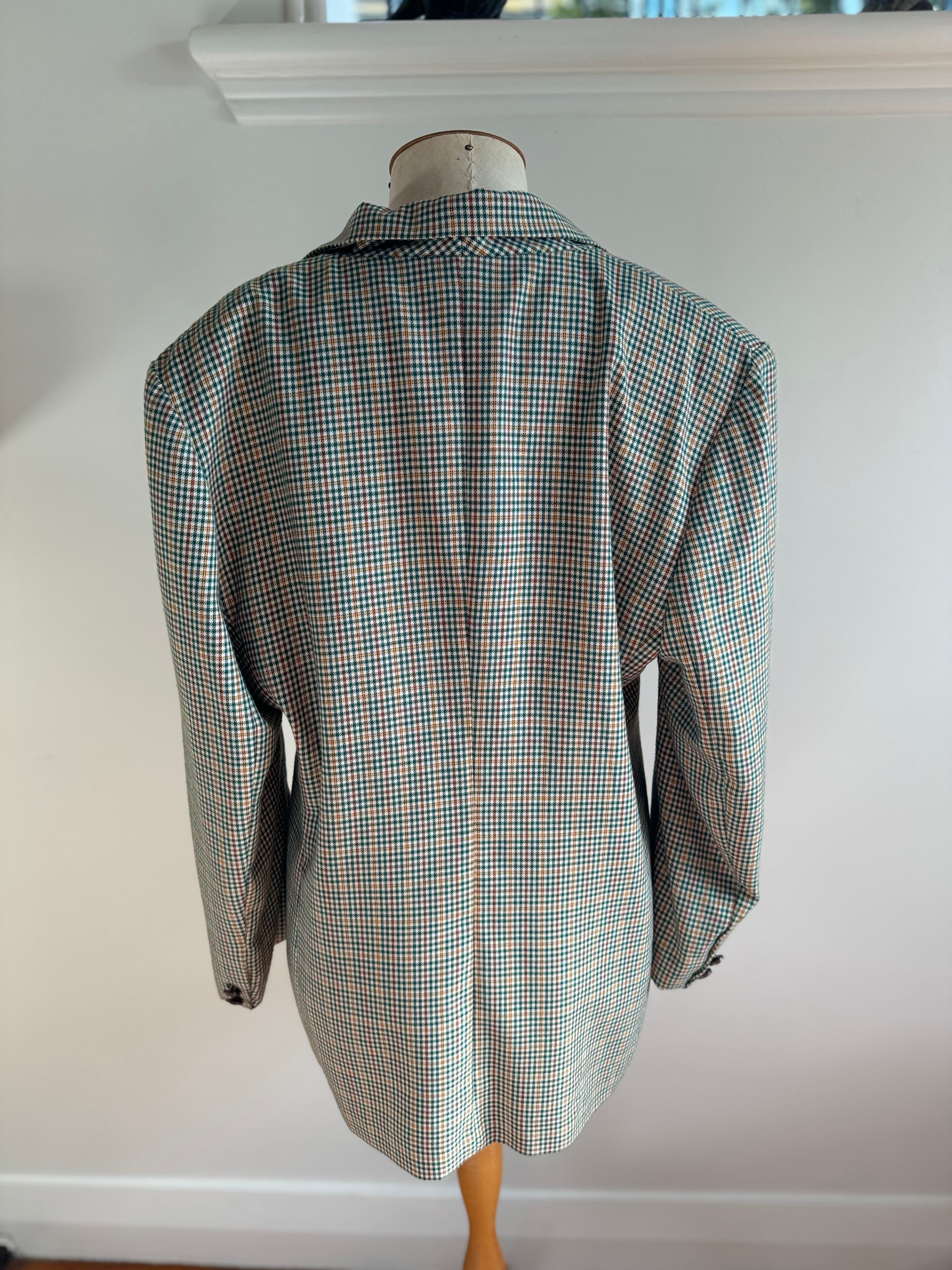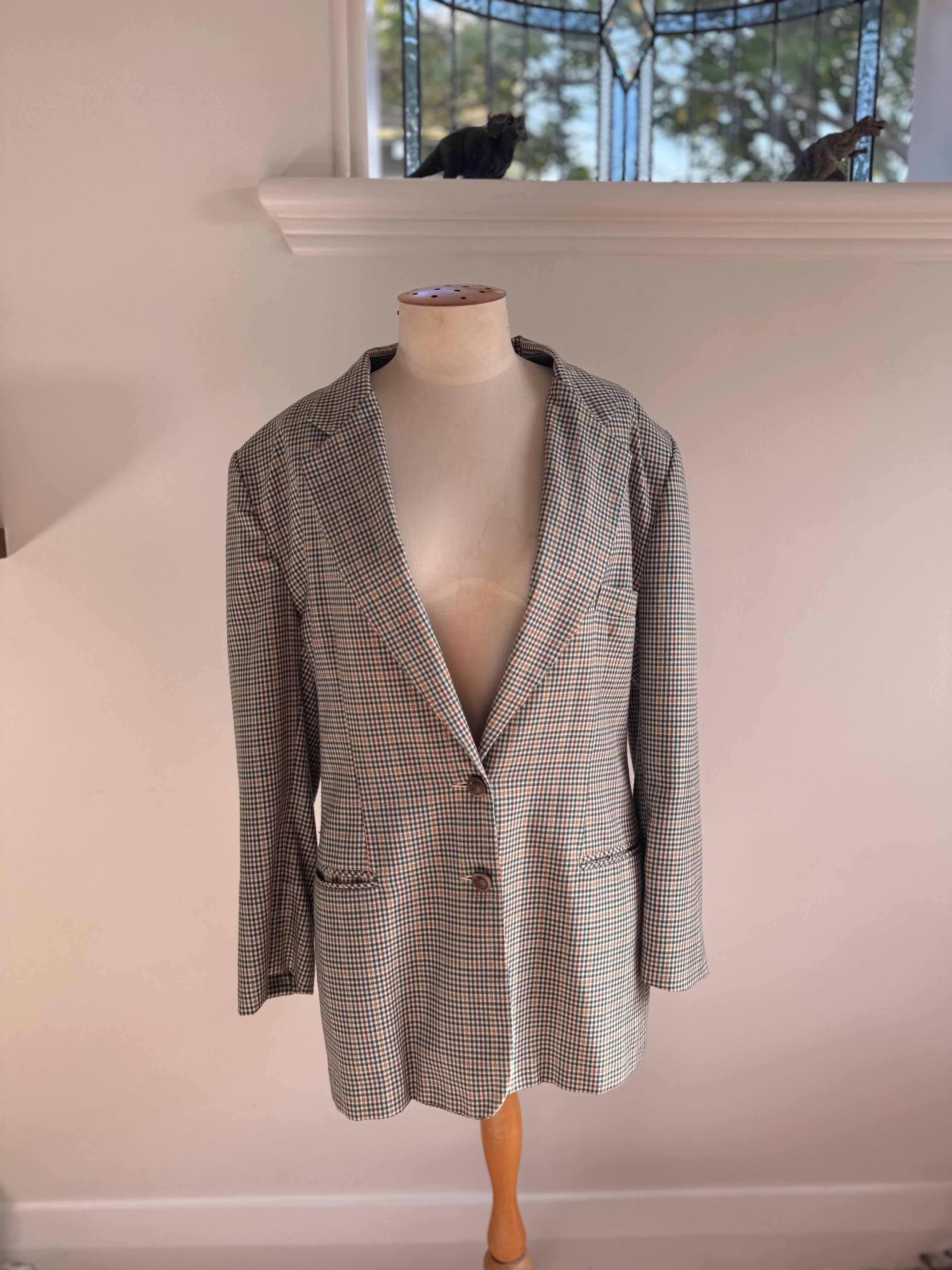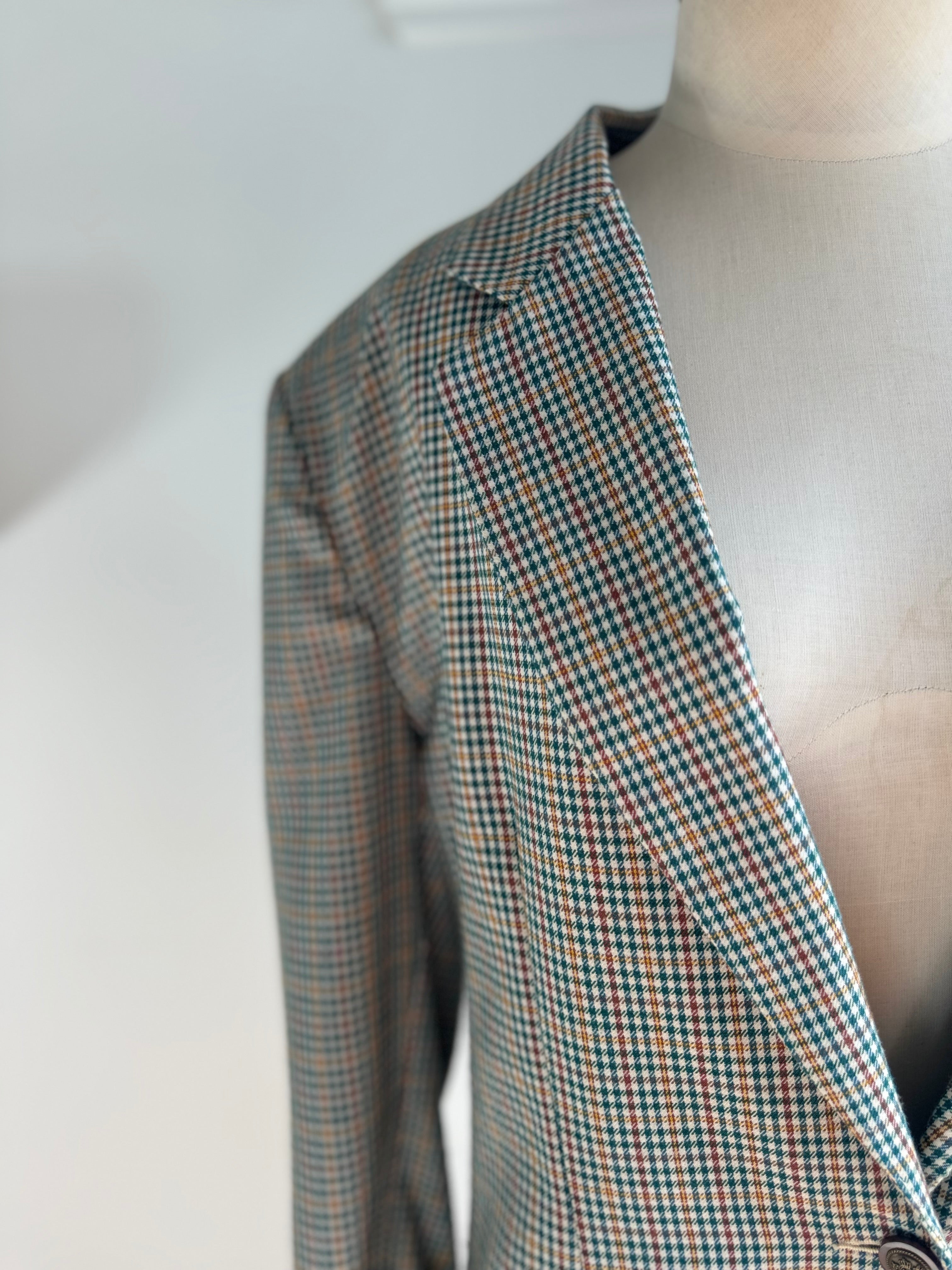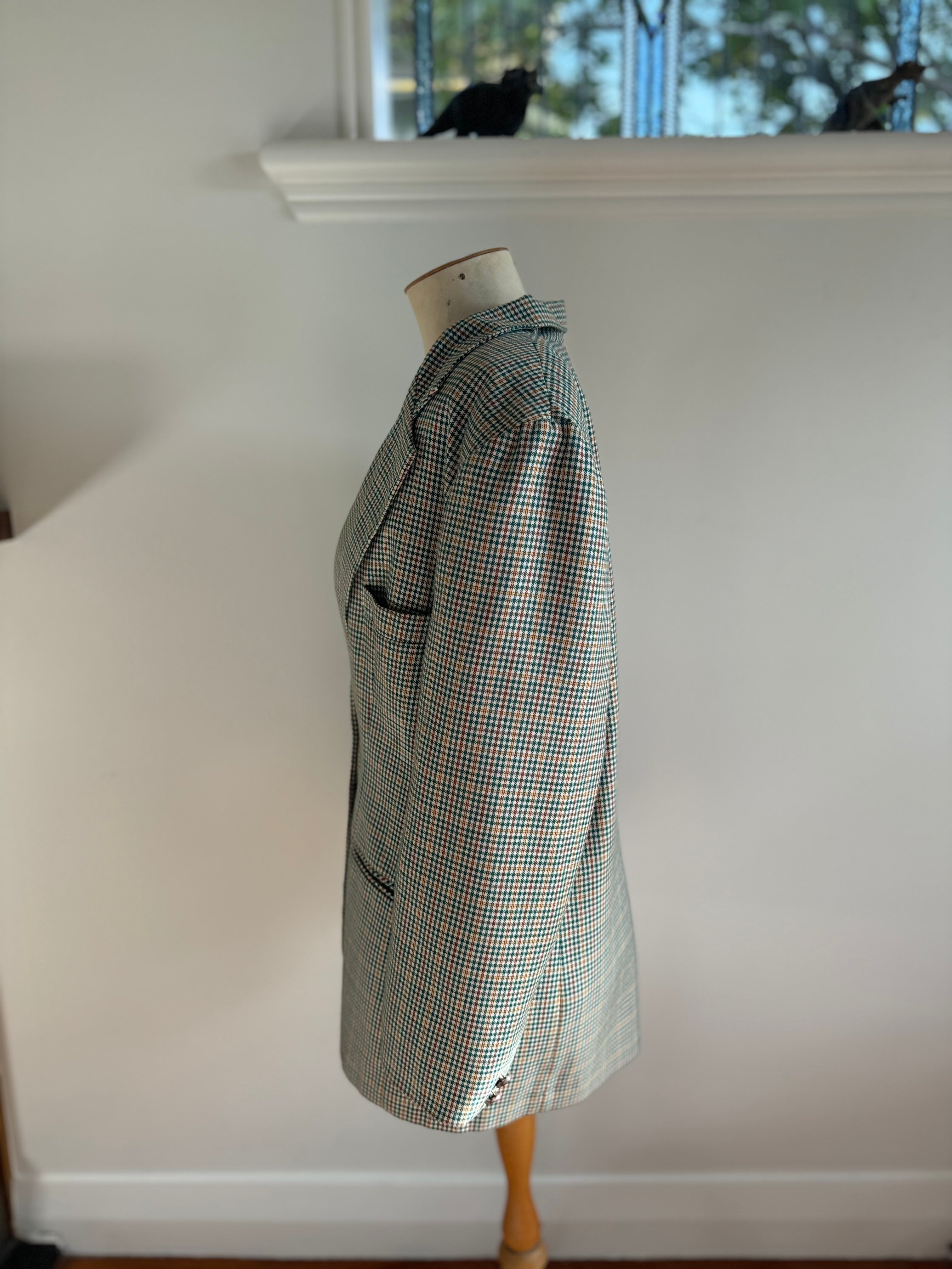 London Affair mini Houndstooth blazer with green burgundy and yellow colour way - but mostly green. Green lining intact - a few spots of discoloration.