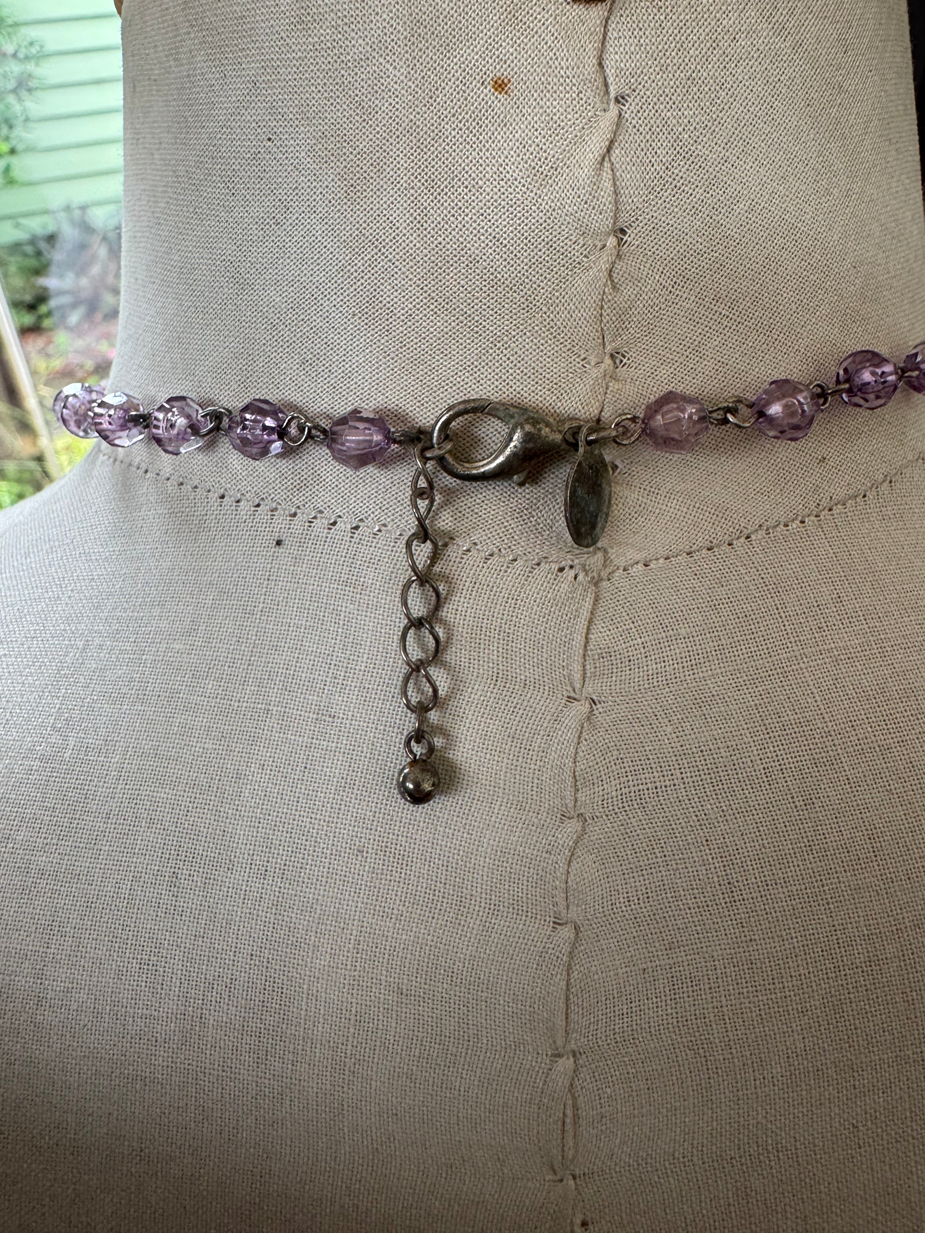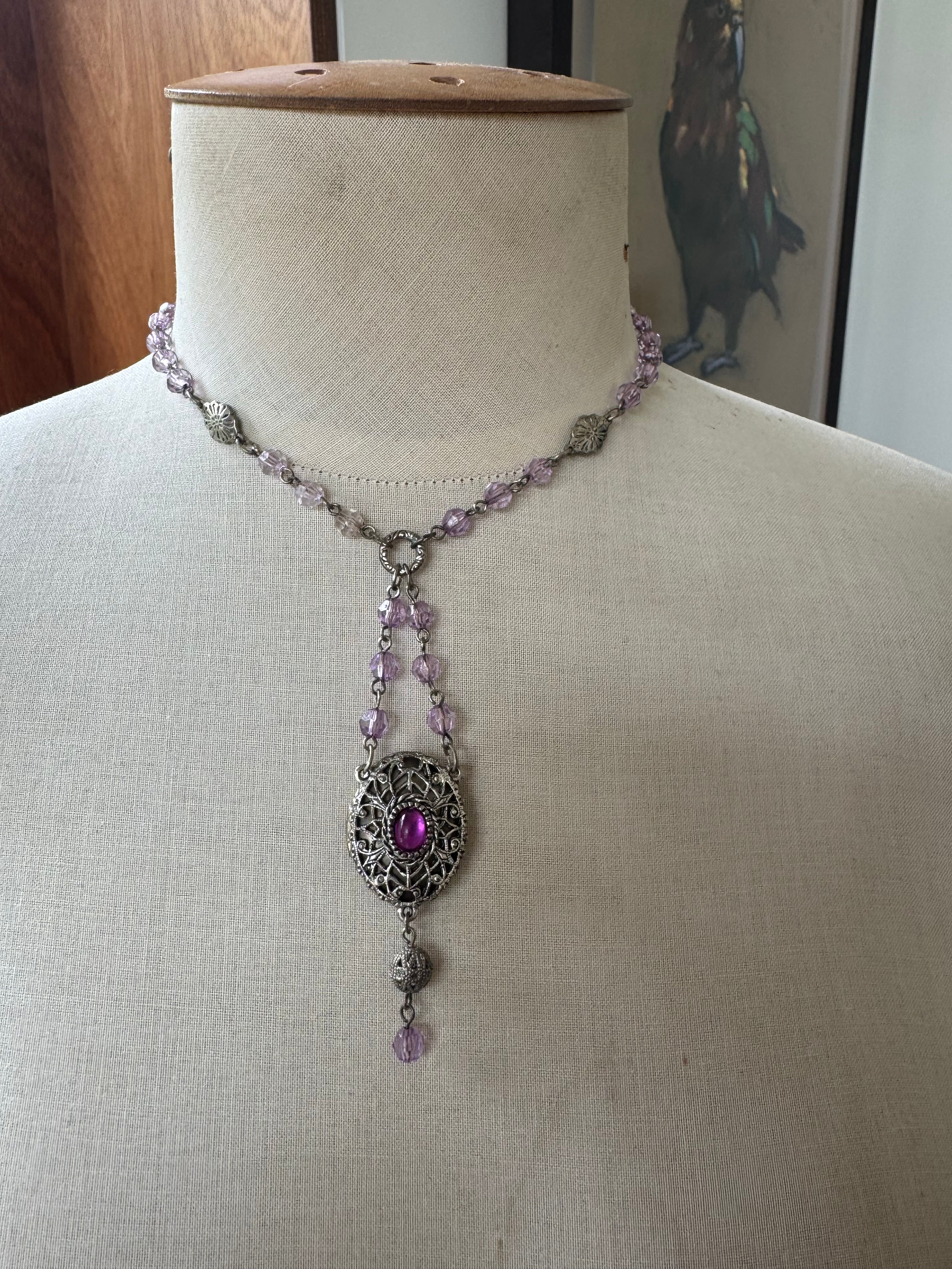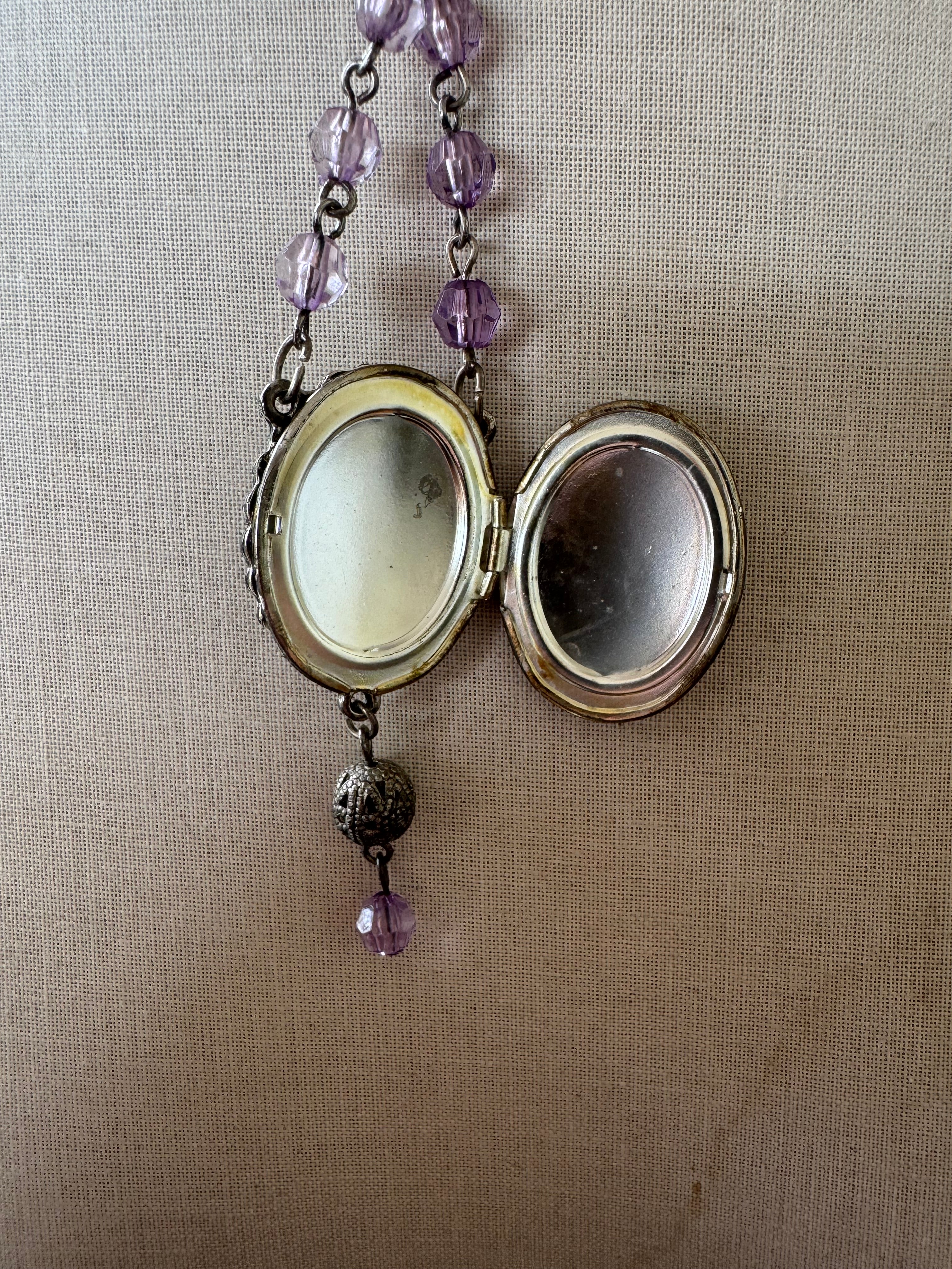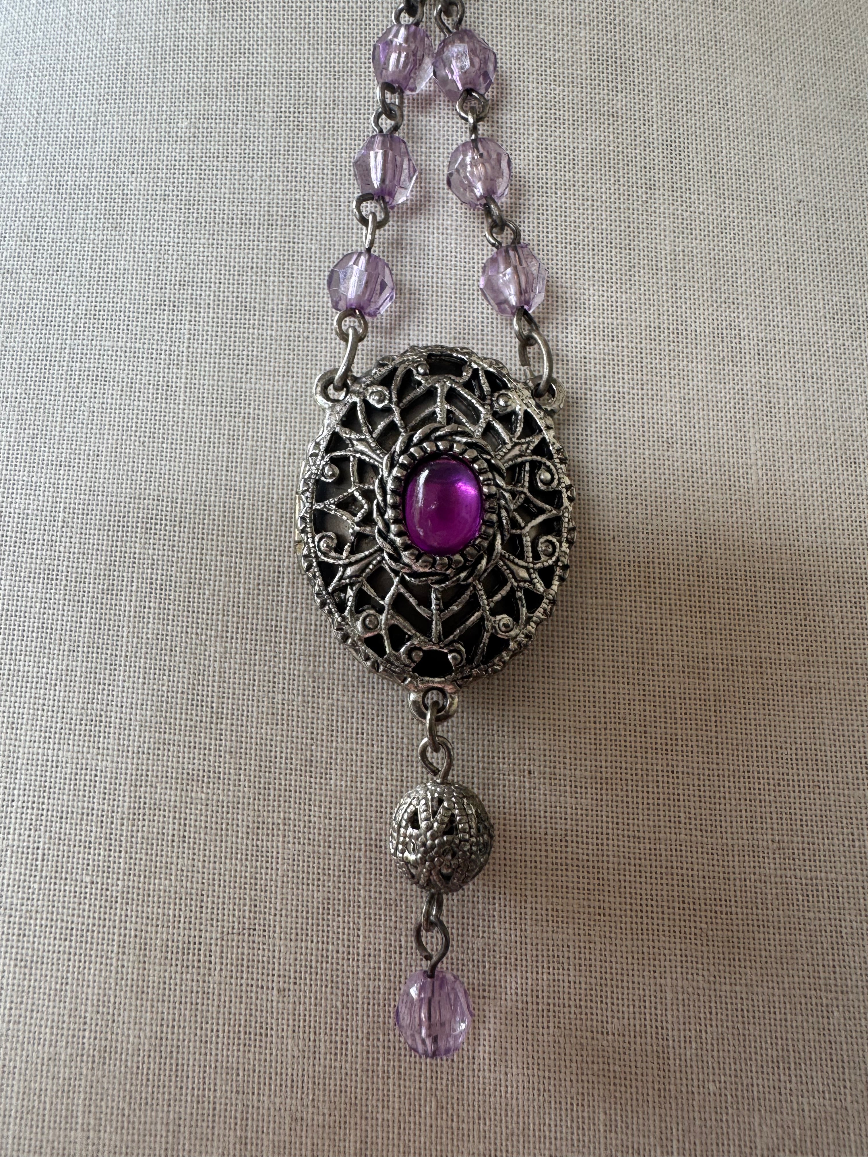 Vintage look costume jewelry with purple beads and locket