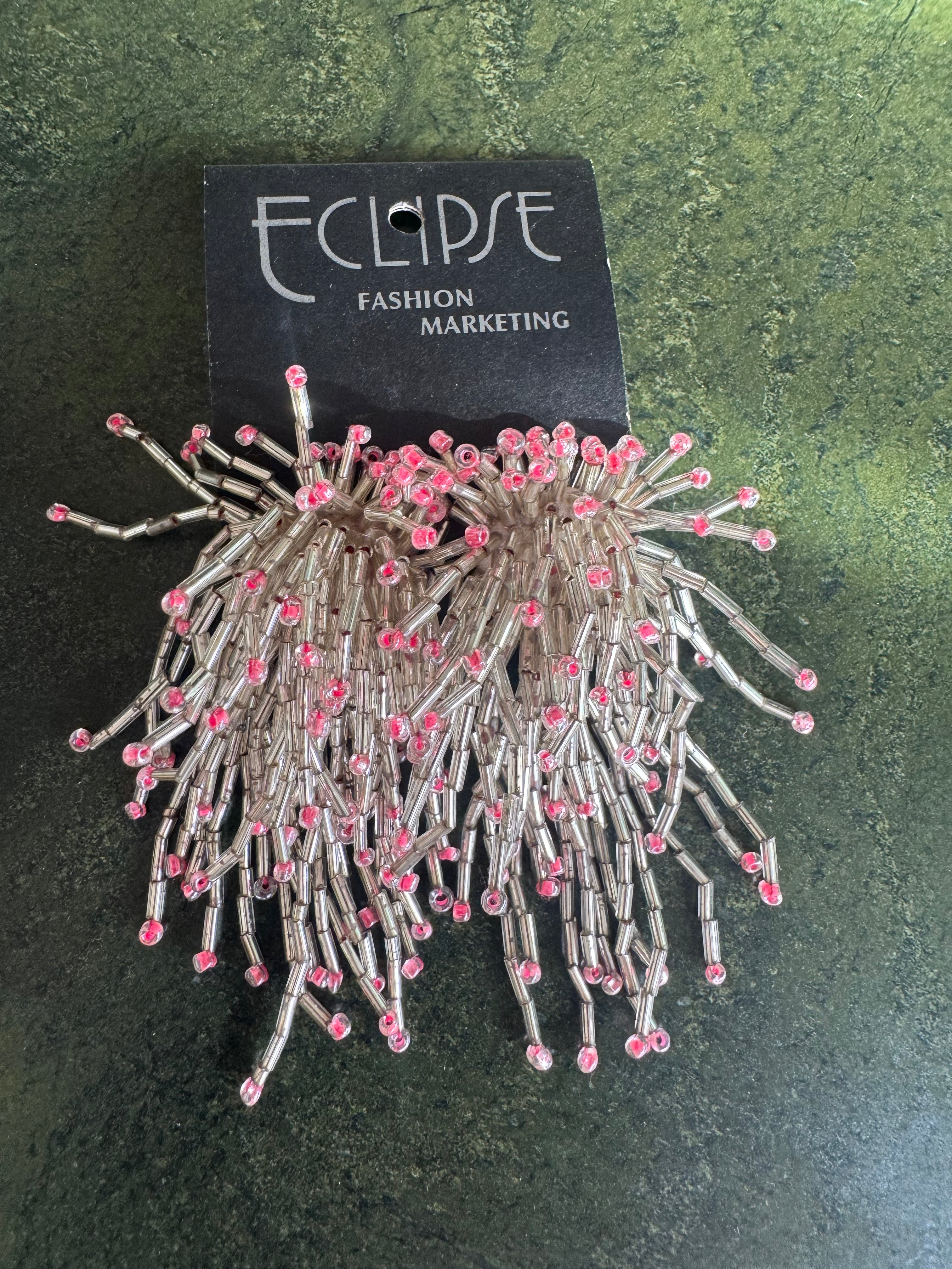 Vintage beaded starburst earrings, interesting anemone style with silver beads with pink glass beads on each of each strand.