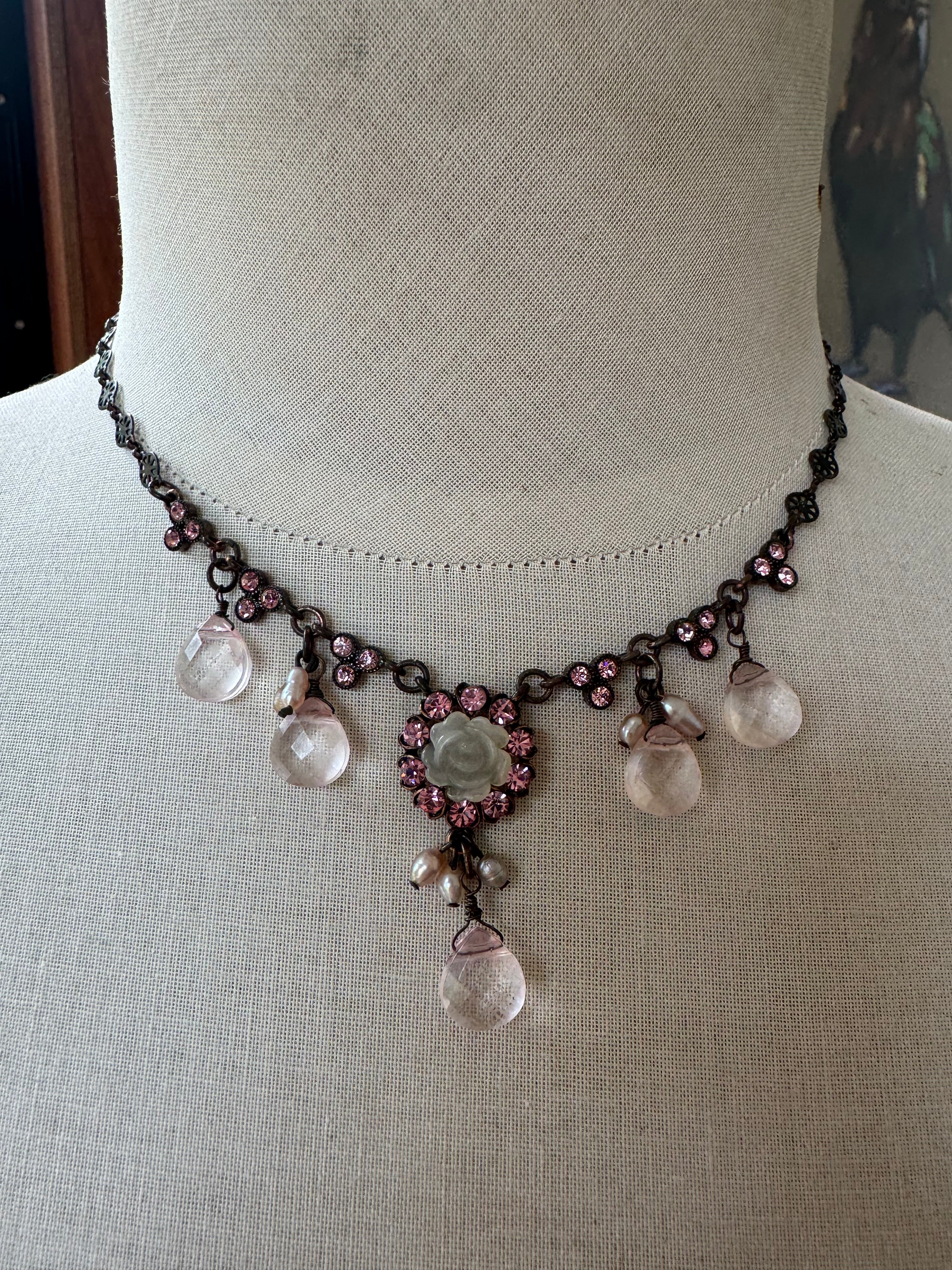 Vintage costume necklace with pink drop, rhinestones and small freshwater pearls featuring a central pendant with carved rose and rhinestones.