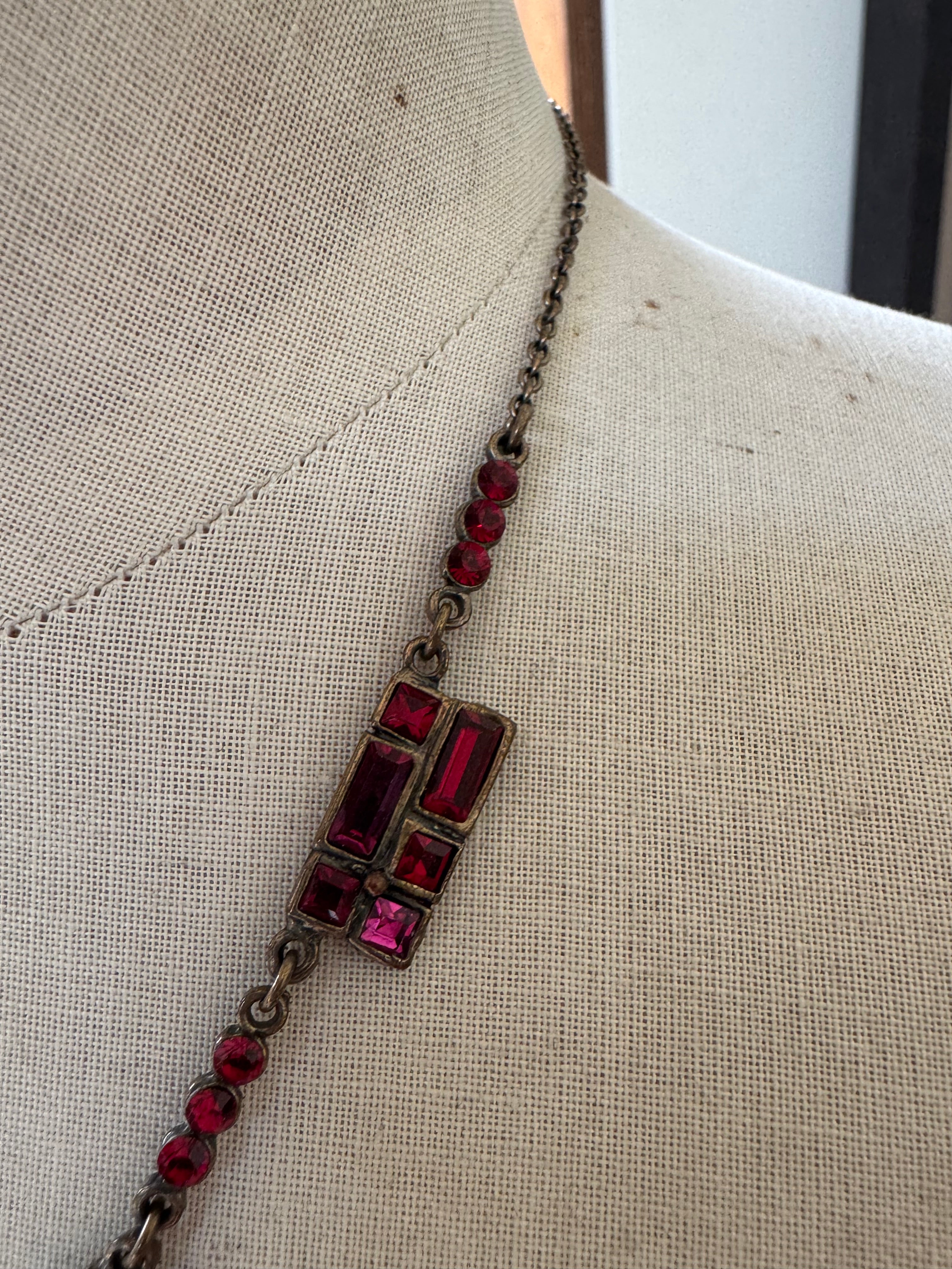 Vintage style geometric necklace with red glass stones along a metal chain. Measuring 50cms measured from end of extender