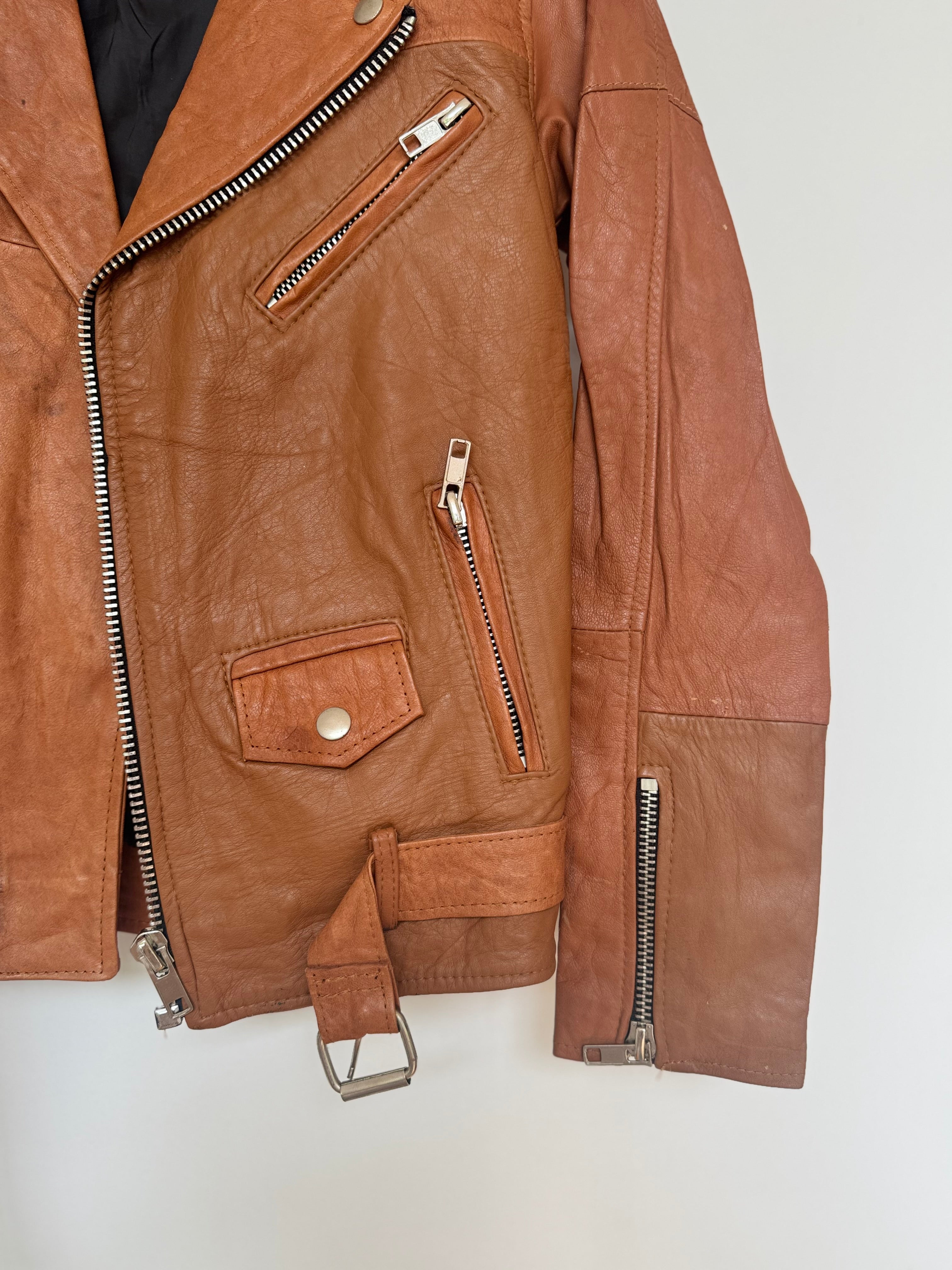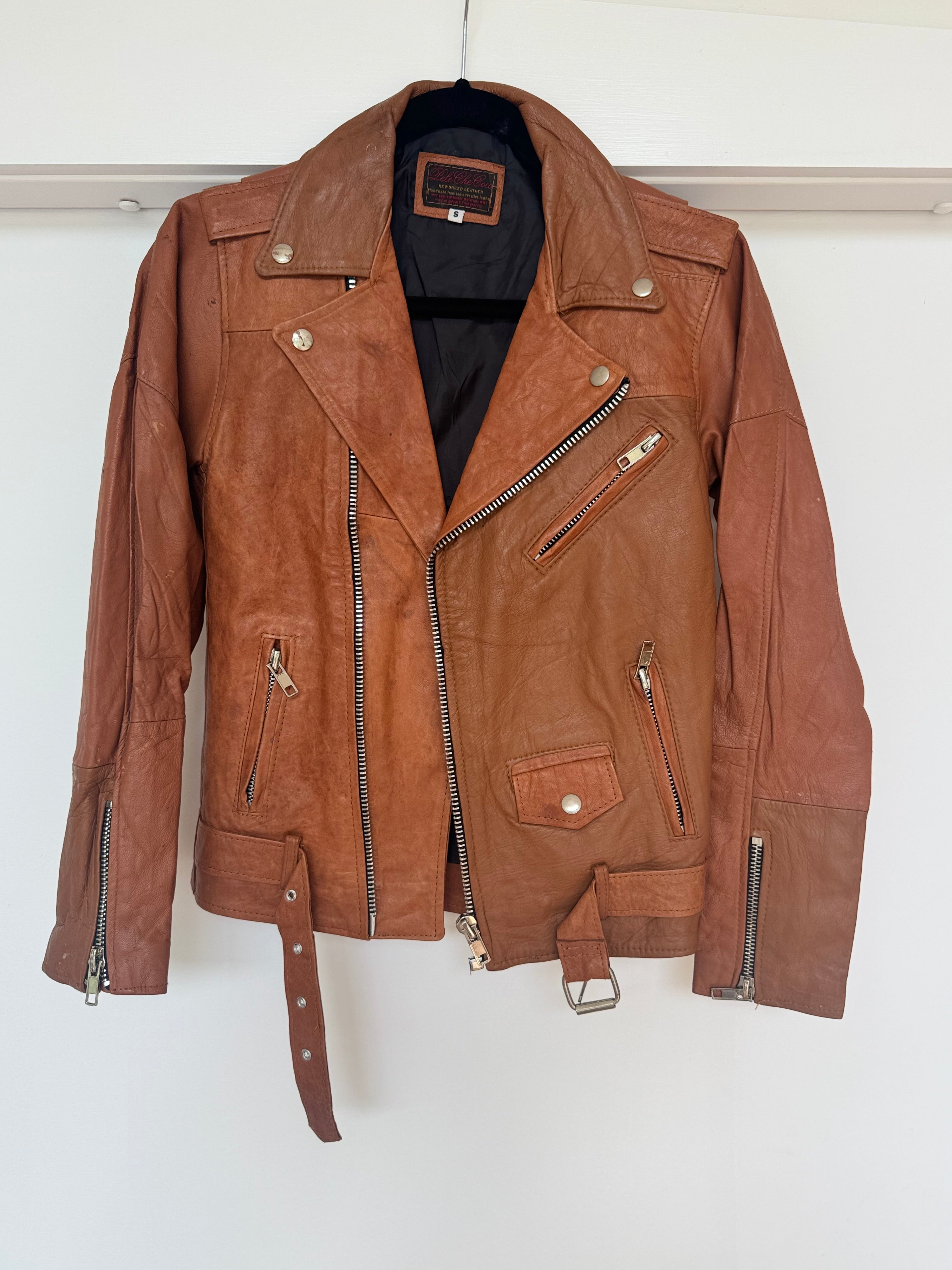 Genuine leather bike jacket. A few marks from age, size 8-10