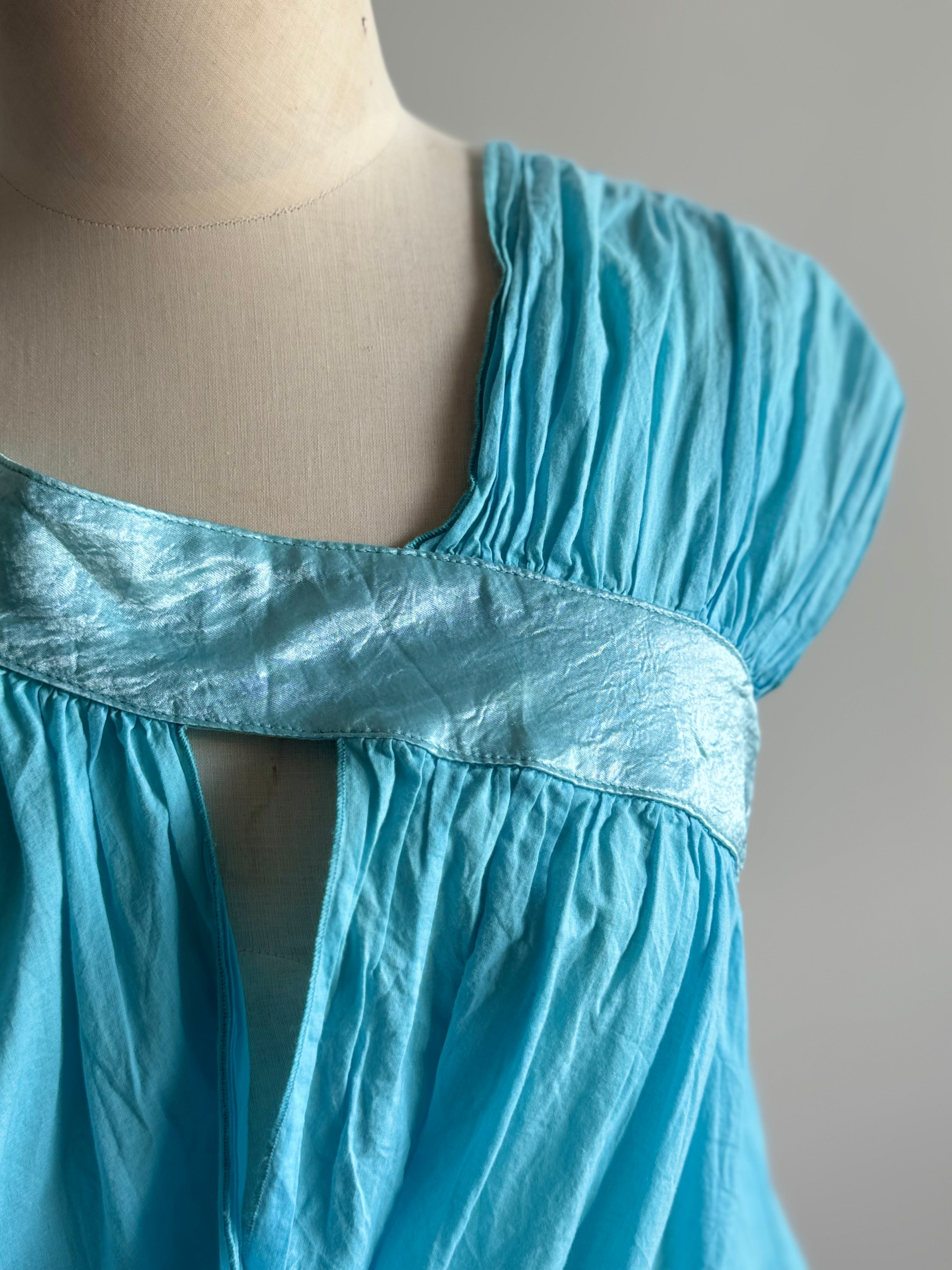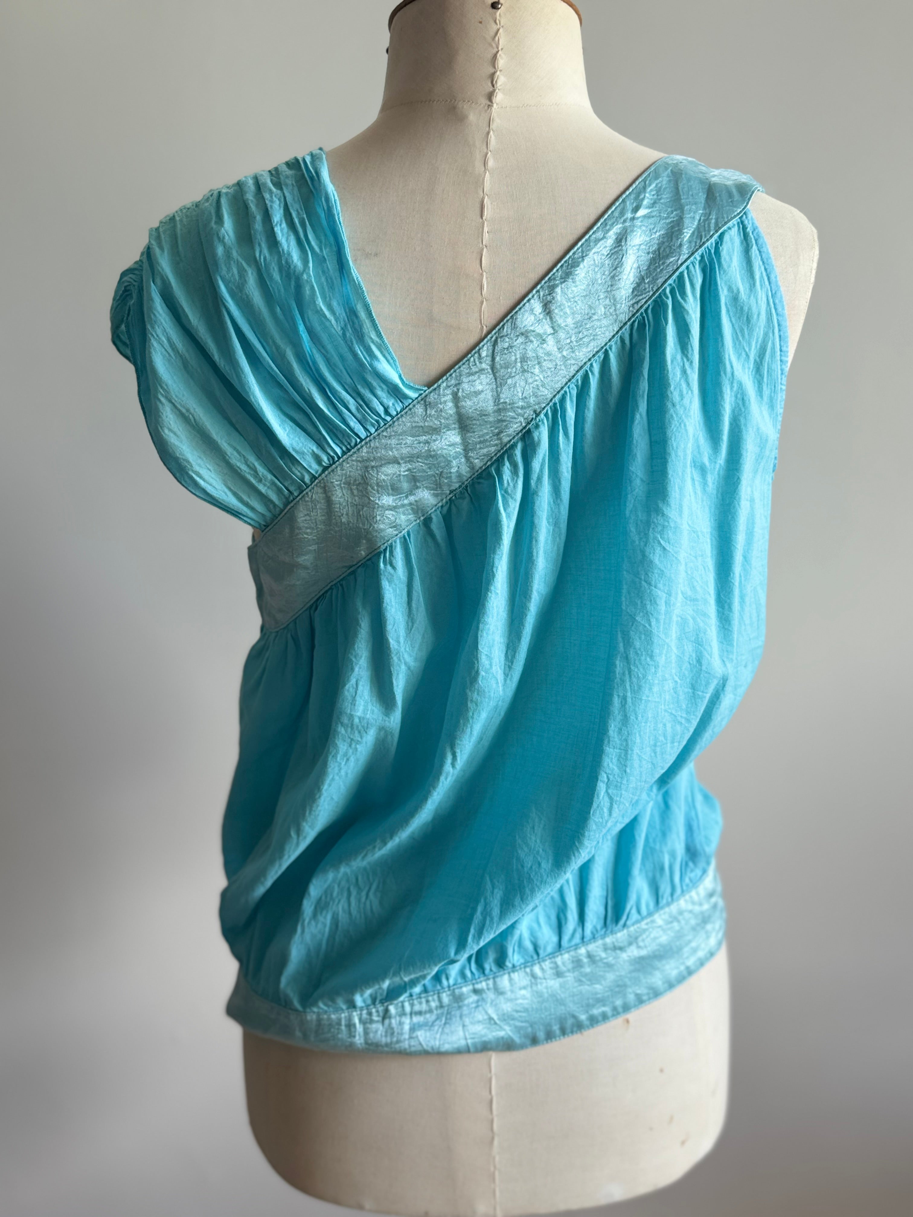 Angela Lewis top, Made in New Zealand. Cotton with acetate banding. Interesting asymmetrical neckline and sleeve with cut out cross over at the front.