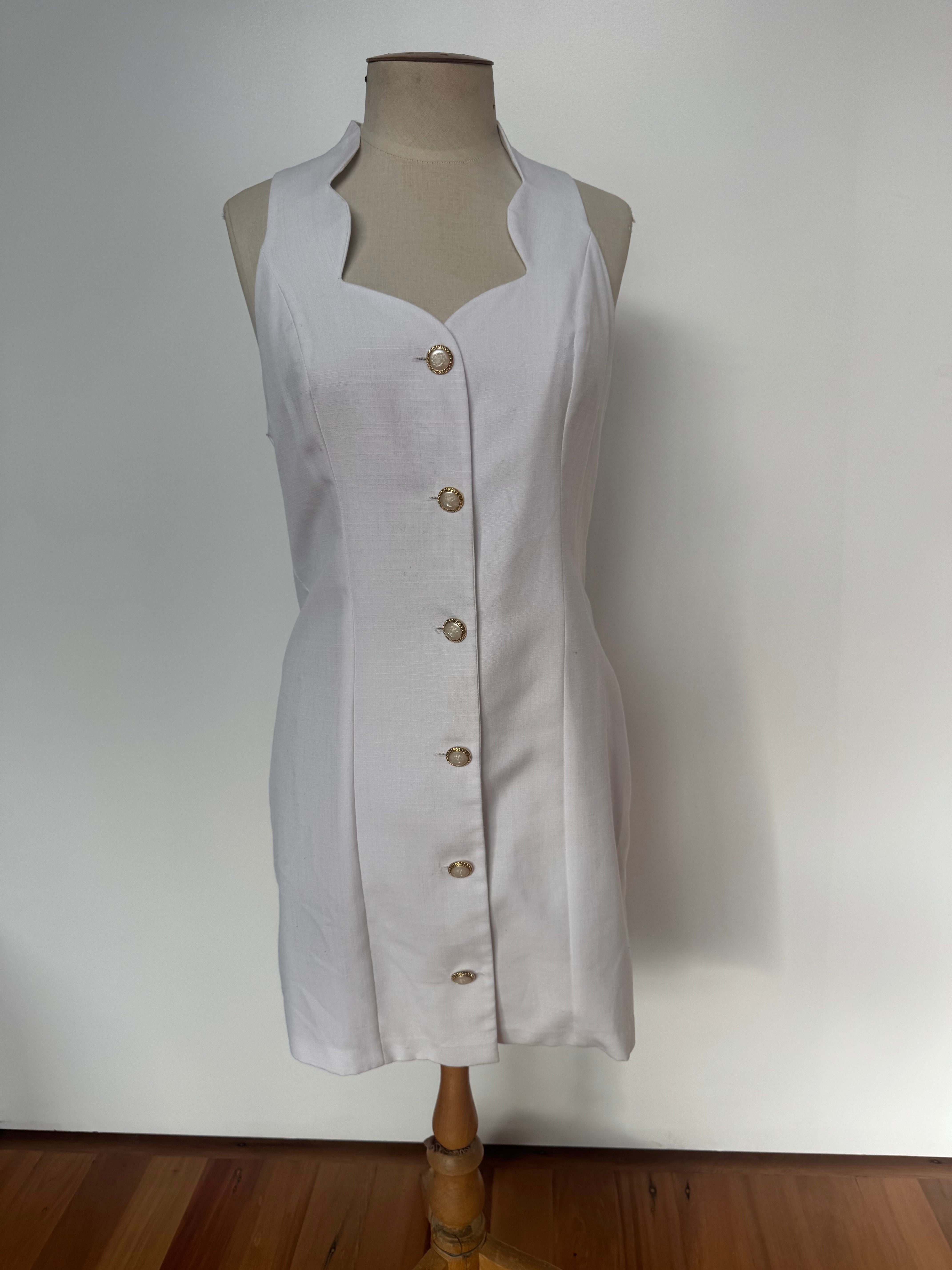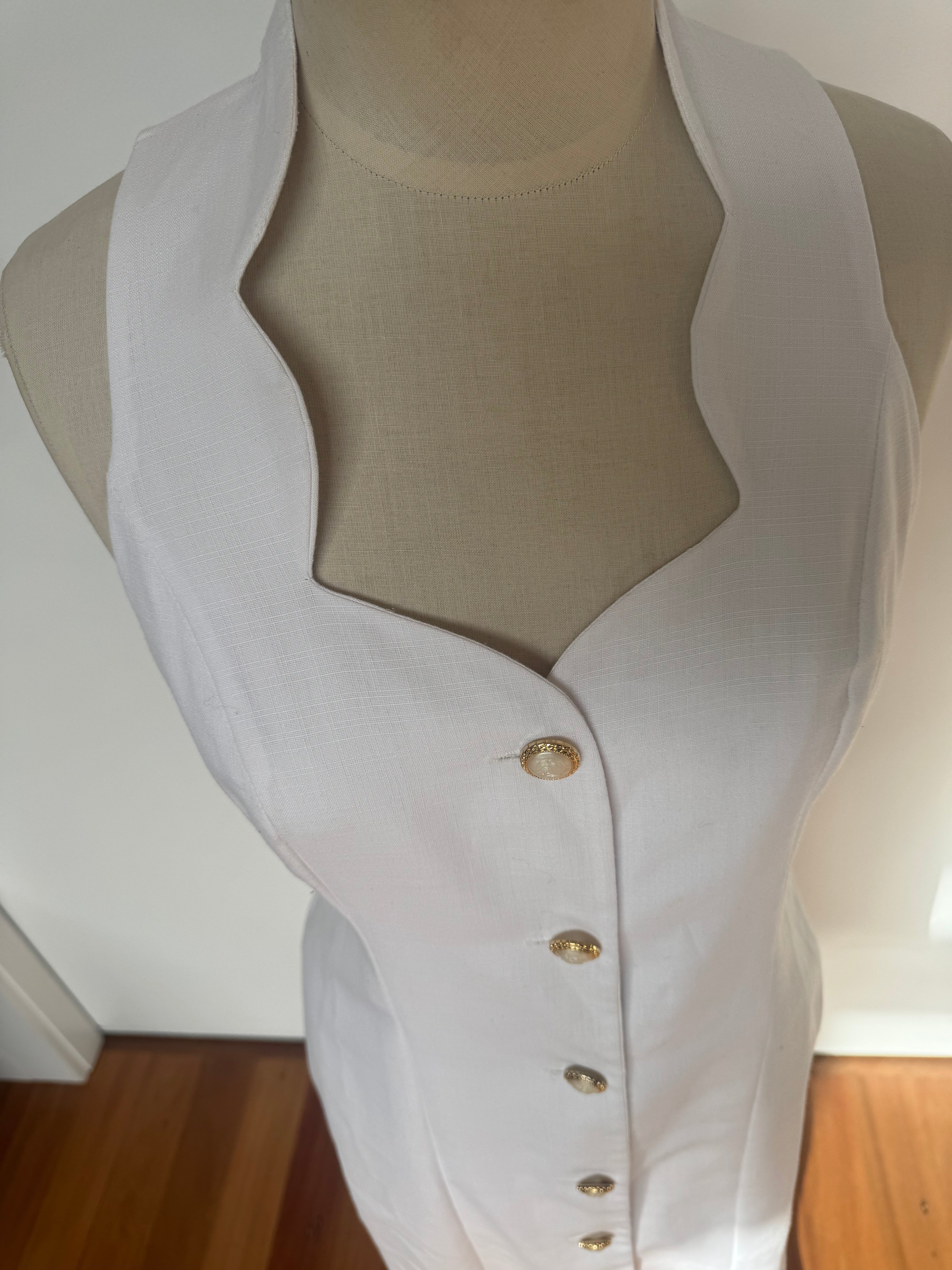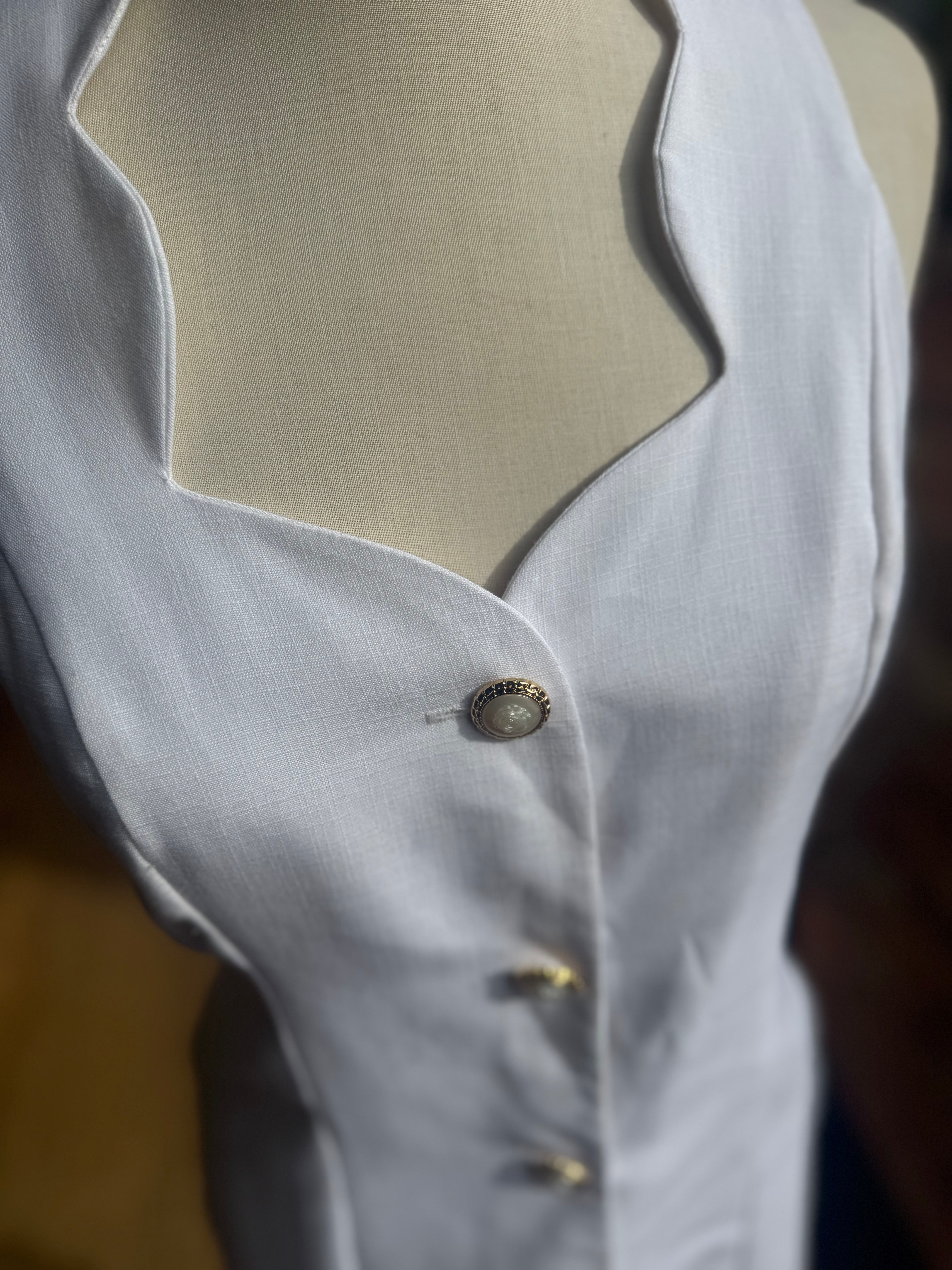 Stunning Joshua Berger White Sleeveless Vest/Dress - interesting scalloped neckline with gorgeous vintage gold buttons with white rose inner. Good vintage/used condition. Polyester/Rayon fabric composition, Made in Australia.