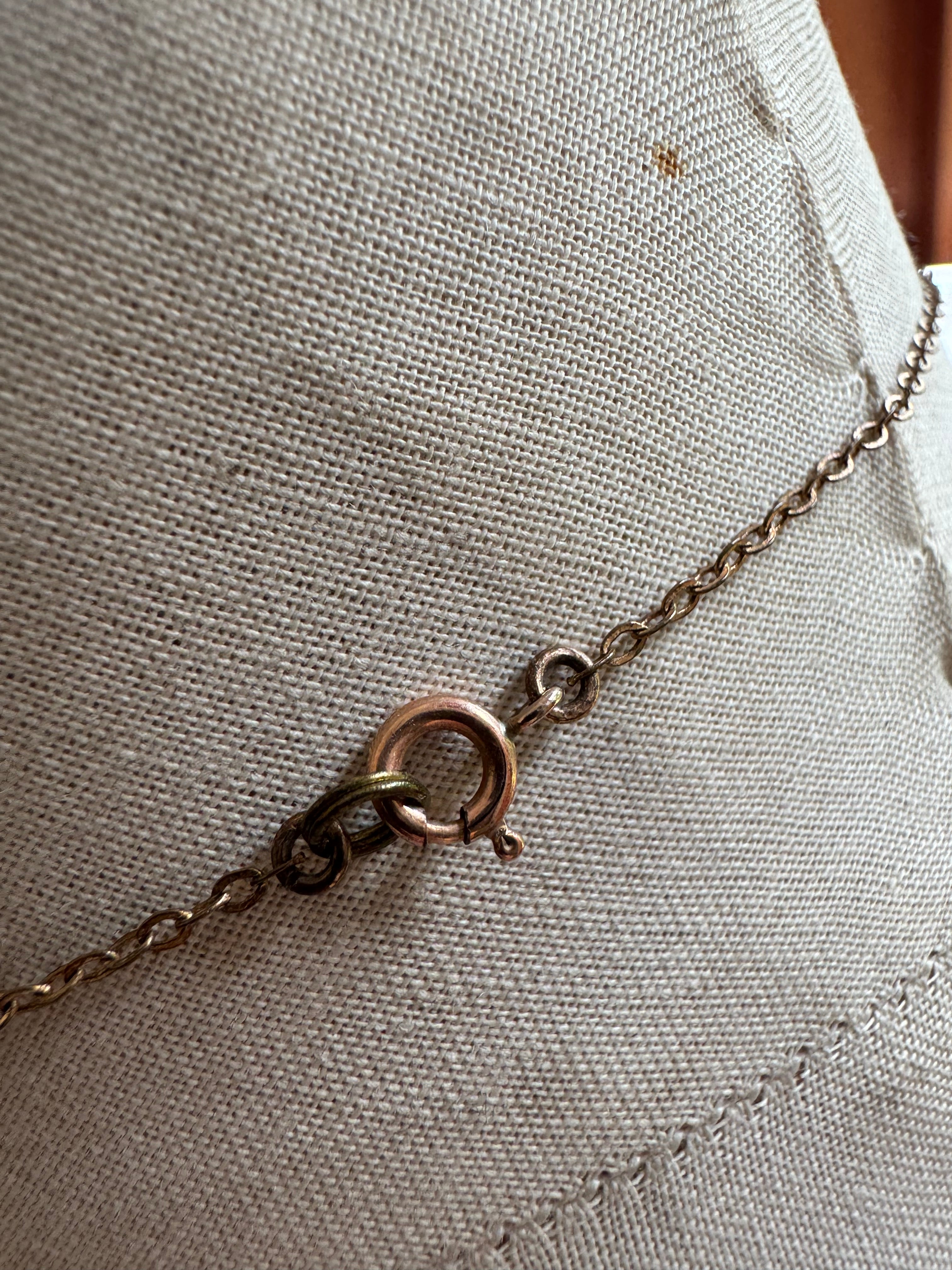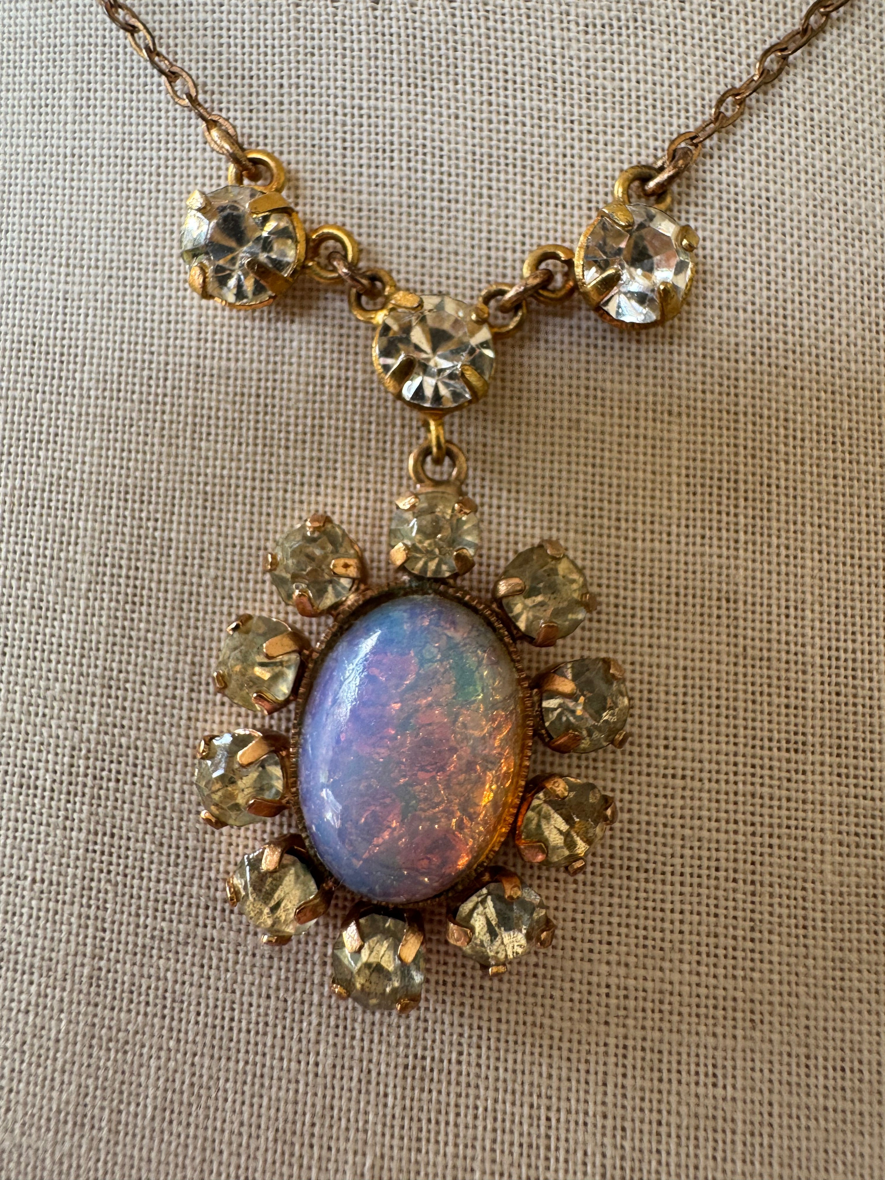 40s-50s synthetic opal cabochon framed by clear faced crystals in a mid century halo setting with additional crystals along the chain.