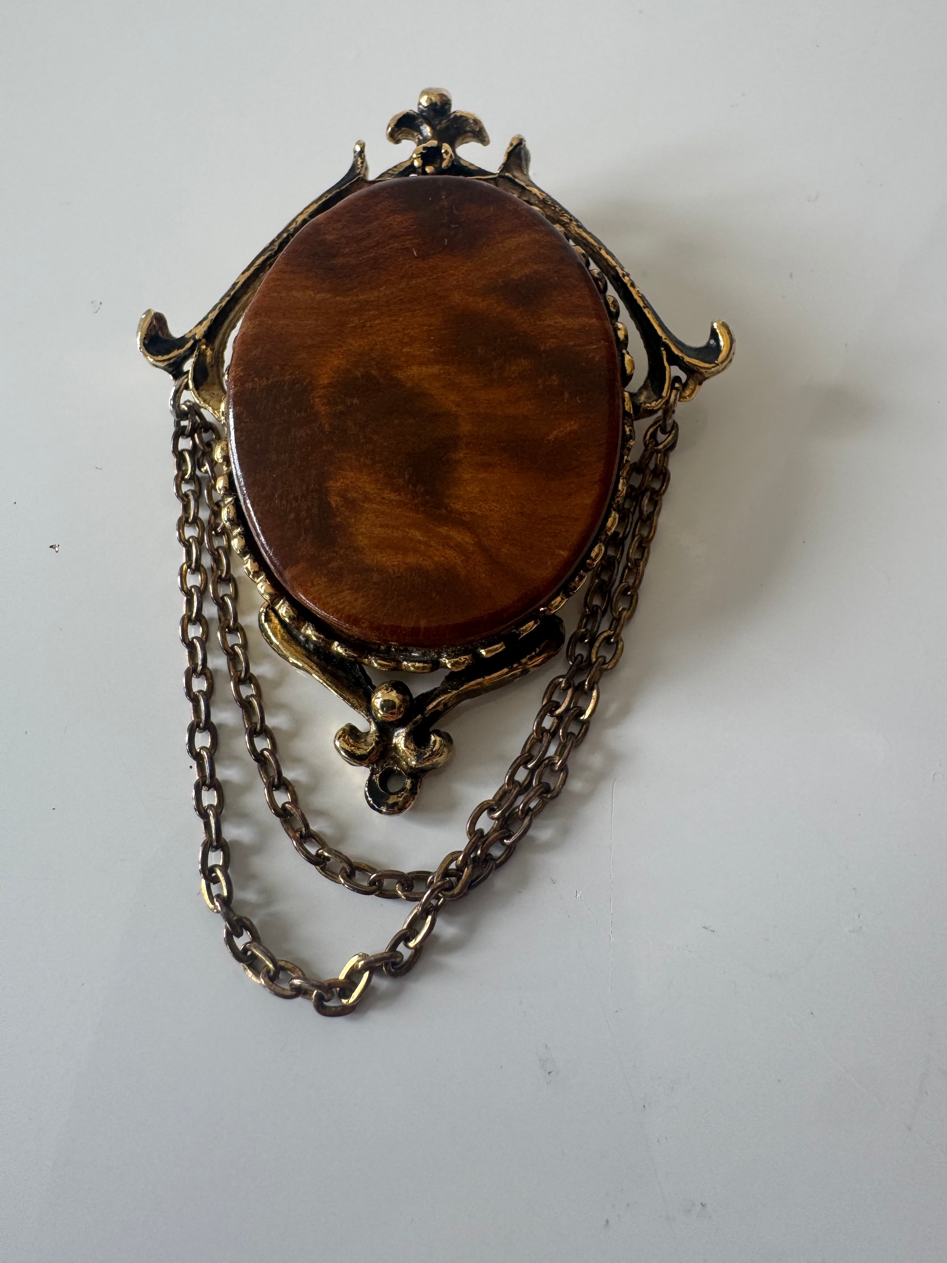 Vintage Tiger Eye and Brass Brooch, from top to bottom of hanging chain is 70cm